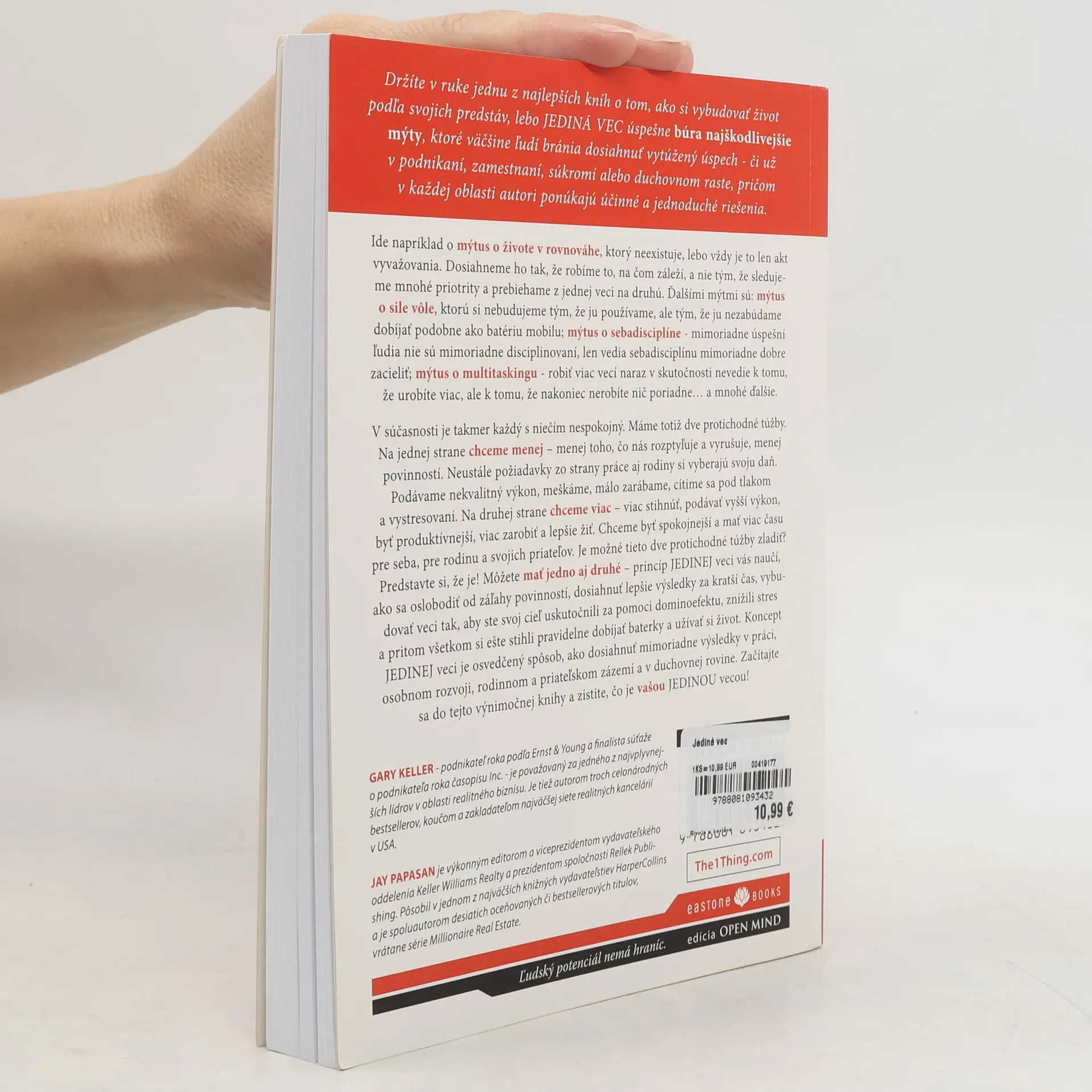 12 knižných ocenení; 350 umiestnení v rôznych rebríčkoch bestsellerov, vrátane tých najrešpektovanejších vo Wall Street Journal, NewYork Times a USA Today; 27 jazykových mutácií a publikovanie vo vyše 30 krajinách sveta; 1 z piatich najlepších biznisových kníh roka; 1 zo sto najlepších biznisových kníh všetkých čias.Držíte v ruke jednu z najlepších kníh o tom, ako si vybudovať život podľa vašich predstáv, lebo JEDINÁ VEC úspešne búra najškodlivejšie mýty, ktoré väčšine ľudí bránia dosiahnuť vytúžený úspech - či už v podnikaní, zamestnaní, súkromí alebo duchovnom raste, pričom v každej oblasti autori ponúkajú účinné a jednoduché riešenia. Koncept JEDINEJ veci je osvedčený spôsob, ako dosiahnuť mimoriadne výsledky v práci, osobnom rozvoji, rodinnom a priateľskom zázemí a v duchovnej rovine. Začítajte sa do tejto výnimočnej knihy a zistite, čo je vašou JEDINOU vecou!