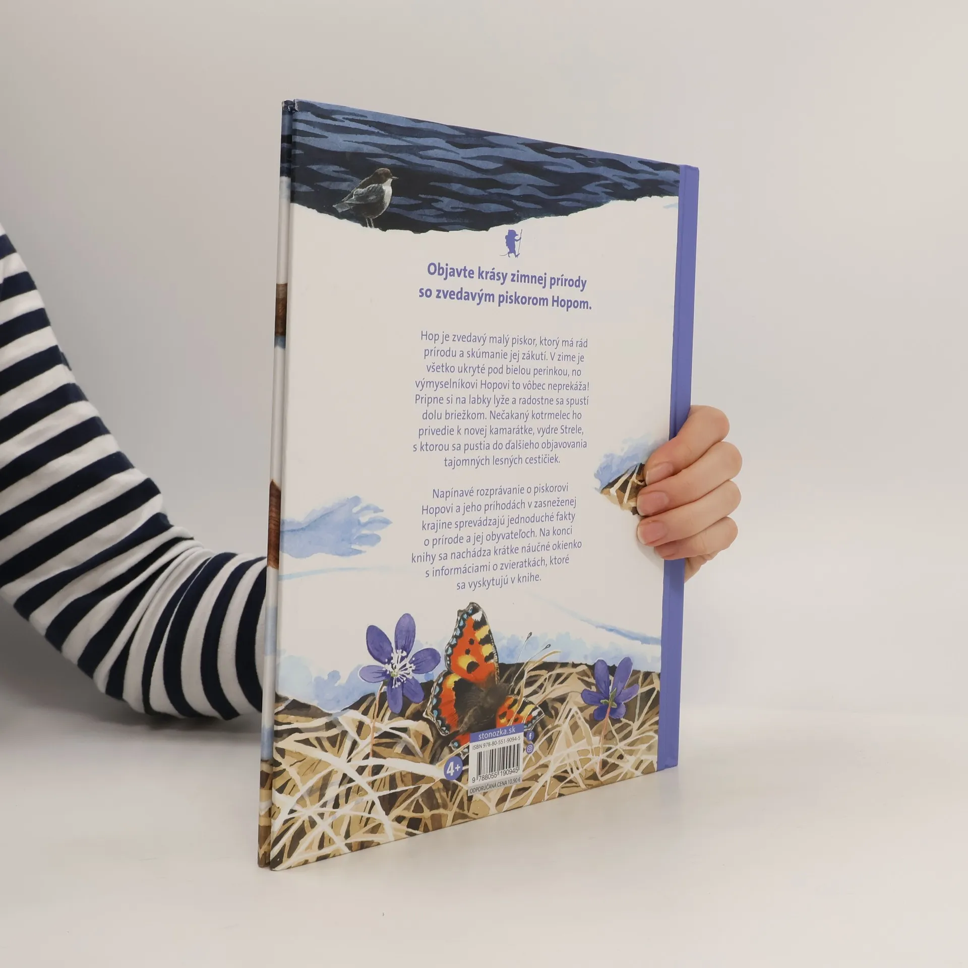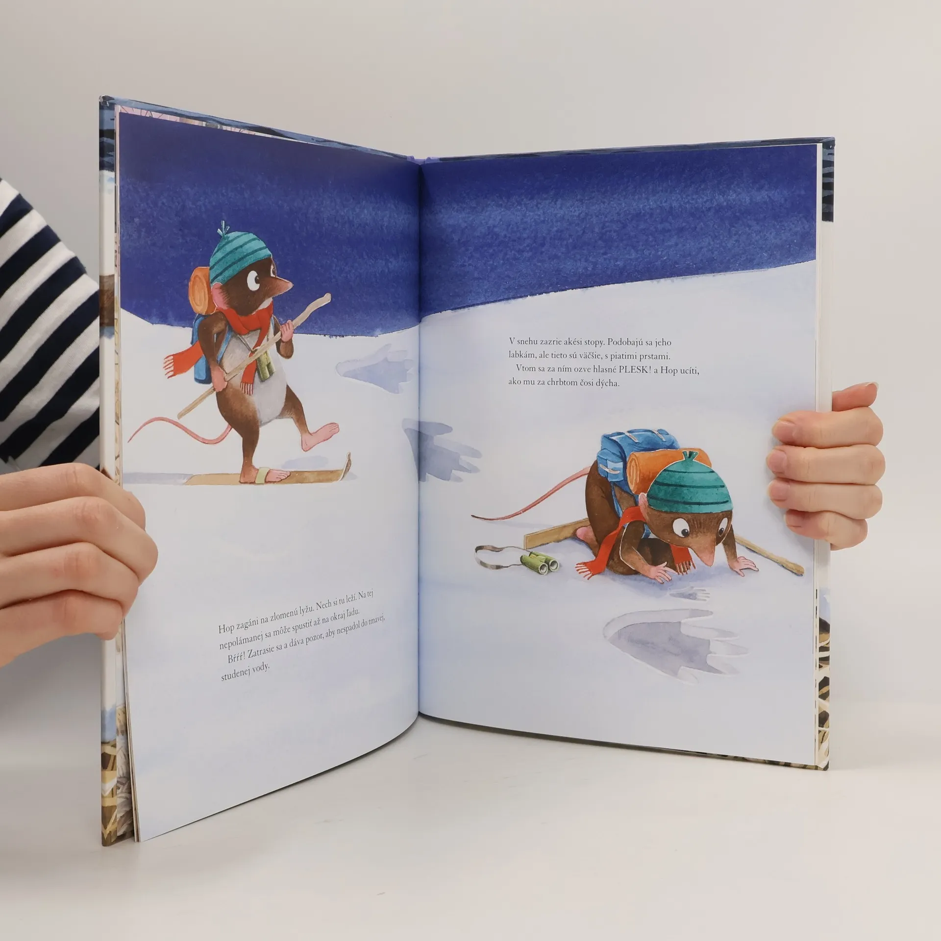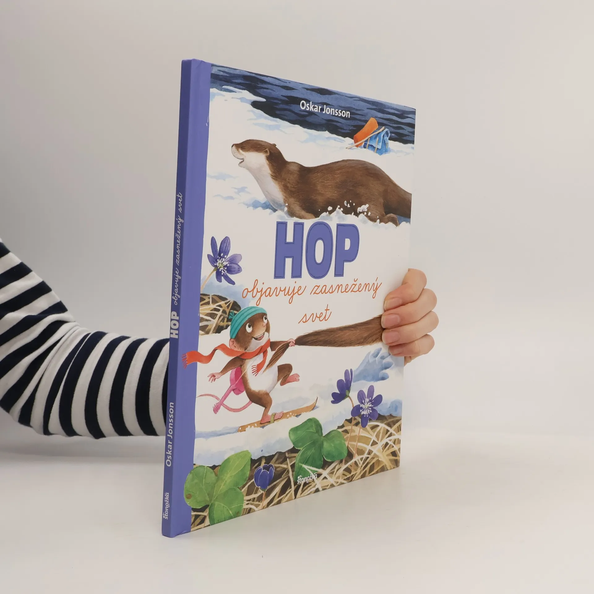 Objavte krásy zimnej prírody so zvedavým piskorom Hopom. Hop je zvedavý malý piskor, ktorý má rád prírodu a skúmanie jej zákutí. V zime je všetko ukryté pod bielou perinkou, no výmyselníkovi Hopovi to vôbec neprekáža! Pripne si na labky lyže a radostne sa spustí dole briežkom. Nečakaný kotrmelec ho privedie k novej kamarátke, vydre Strele, s ktorou sa pustia do ďalšieho objavovania tajomných lesných cestičiek. Napínavé rozprávanie o piskorovi Hopovi a jeho príhodách v zasneženej krajine sprevádzajú jednoduché fakty o prírode a jej obyvateľoch. Na konci knihy sa nachádza krátke náučné okienko s informáciami o zvieratkách, ktoré sa vyskytujú v knihe. Knihy o piskorovi Hopovi napísal a ilustroval Oskar Jonsson a zrkadlí sa v nich jeho záujem o divoké zvieratá a prírodu. Zo švédskeho originálu preložil Miroslav Zumrík. Pre deti od 4 rokov.
