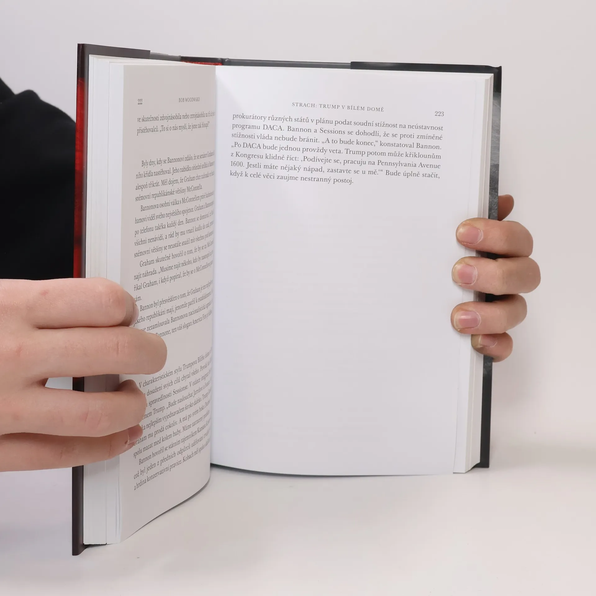 STRACH je nejintimnějším portrétem úřadujícího prezidenta, jaký byl kdy publikován během prezidentových prvních roků ve funkci. “Přes všechny téměř každodenní zprávy o chaosu a neshodách v Bílém domě neměla veřejnost tušení, jak špatná interní situace doopravdy je. Trump se choval rozporuplně a nevypočitatelně, zřídkakdy se dokázal soustředit. Pokud ho něco rozčílilo, když měl špatnou náladu, klidně dokázal o obchodní smlouvě KORUS prohlásit, „Dnes odstupujeme.“ Nyní však zde byl dopis, datovaný 5. září 2017, potencionální rozbuška ohrožující národní bezpečnost. Cohn se obával, že pokud Trump dopis uvidí, bez váhání ho podepíše. Cohn sebral koncept dopisu z pracovního stolu. Uložil ho do modré složky s označením „KEEP“. „Ukradl jsem ho z jeho stolu,“ svěřil se později kolegovi. „Nechtěl jsem, aby ho četl. Ten dokument nikdy neuvidí. Musím chránit naši zem.“ Vzhledem k anarchii a nepořádku, které panovaly v Bílém domě i Trumpově mysli, prezident chybějící dopis nezaregistroval.” Autoritativním reportážním stylem, vytříbeným během vlády osmi prezidentů od Nixona až k Obamovi, odhaluje autor Bob Woodward v bezprecedentních detailech skutečnou tvář života uvnitř Bílého domu za vlády prezidenta Donalda Trumpa, včetně toho, jakým způsobem prezident dospívá k rozhodnutím v závažných otázkách zahraniční a domácí politiky.