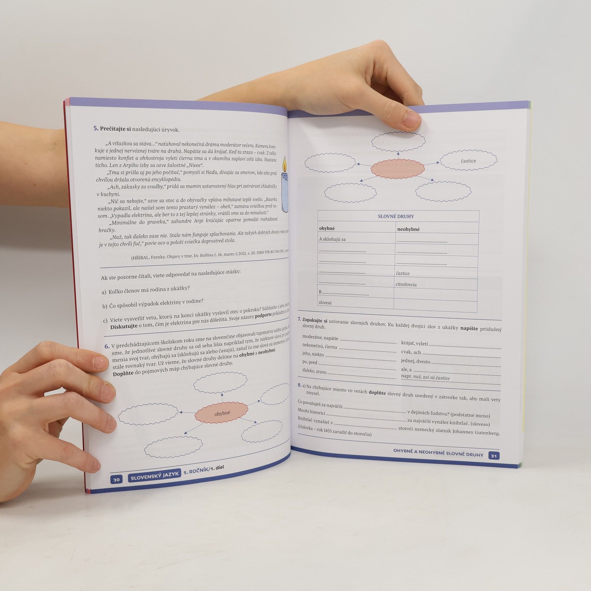 Pracovná učebnica Slovenský jazyk pre 5. ročník je prvým dielom série učebníc slovenského jazyka pre žiakov 5. – 9. ročníka základnej školy. Svojím originálnym a inovatívnym spracovaním nahliada na učivo z pohľadu detí s rozličnými typmi tvorivosti, inteligencie, schopností a záujmov. Tie vystupujú v úlohe sprievodcov jednotlivými kapitolami prvého a druhého dielu učebnice, čím sa učenie materinského jazyka stáva pre žiakov atraktívnym, motivujúcim a zábavným.