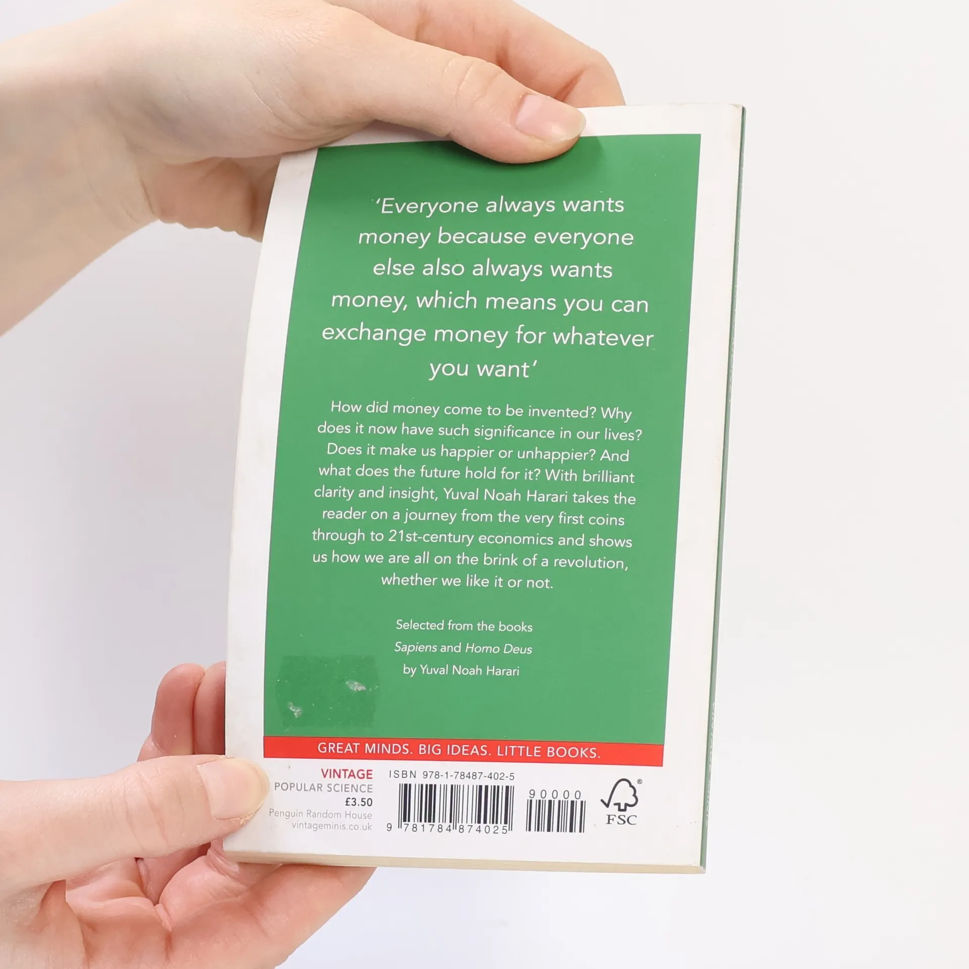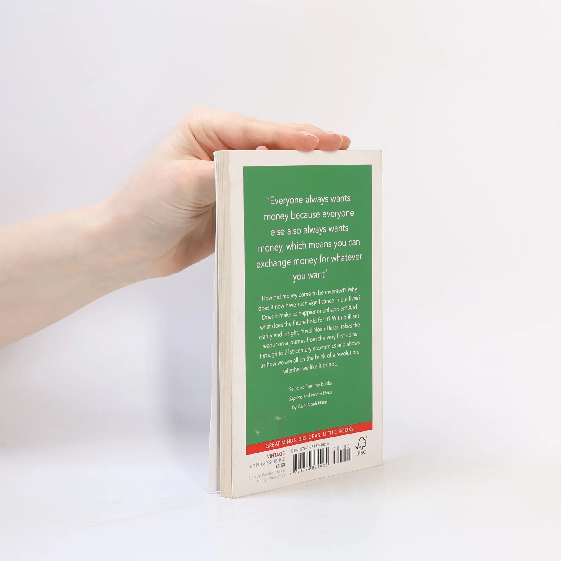 Selected from the books Sapiens and Homo Deus by Yuval Noah Harari How did money come to be invented? Why does it now have such significance in our lives? Does it make us happier or unhappier? And what does the future hold for it? With brilliant clarity and insight, Yuval Noah Harari takes the reader on a journey from the very first coins through to 21st century economics and shows us how we are all on the brink of a revolution, whether we like it or not. VINTAGE MINIS- GREAT MINDS. BIG IDEAS. LITTLE BOOKS. A series of short books by the world's greatest writers on the experiences that make us human Also in the Vintage Minis series- Home by Salman Rushdie Babies by Anne Enright Eating by Nigella Lawson Drinking by John Cheever