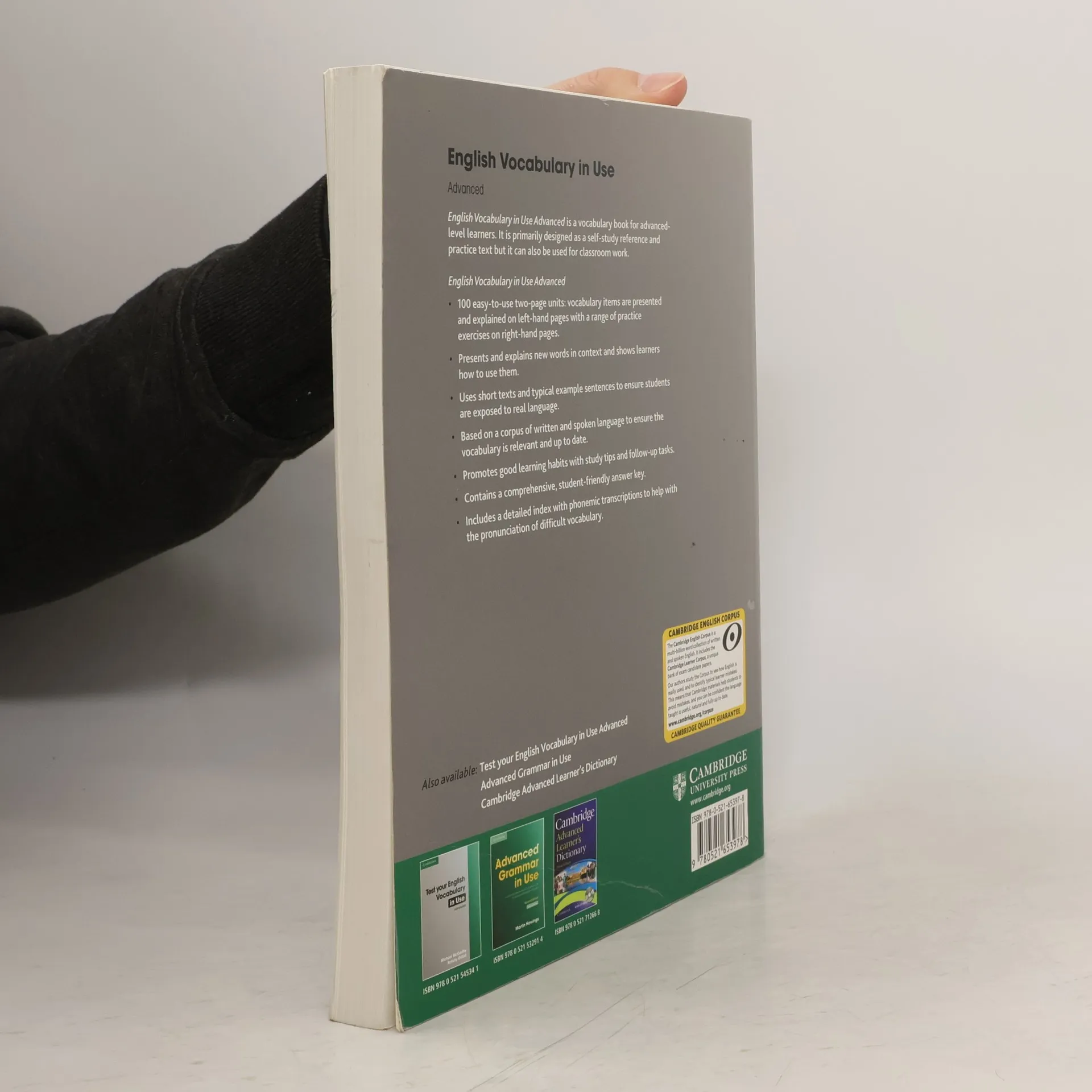 The fourth in the family of best-selling vocabulary reference and practice books from elementary to advanced level. The perfect choice for advanced-level students wanting to build their vocabulary skills. English Vocabulary in Use: Advanced includes over 2,000 new words and expressions which are presented and practised in typical contexts appropriate to this level. The book is informed by the Cambridge International Corpus to ensure that the vocabulary selected is useful and up-to-date. A test book (Test Your English Vocabulary in Use: Advanced - 0521 54534X) is also available for extra practice. This 'with answers' edition is ideal for self-study.
