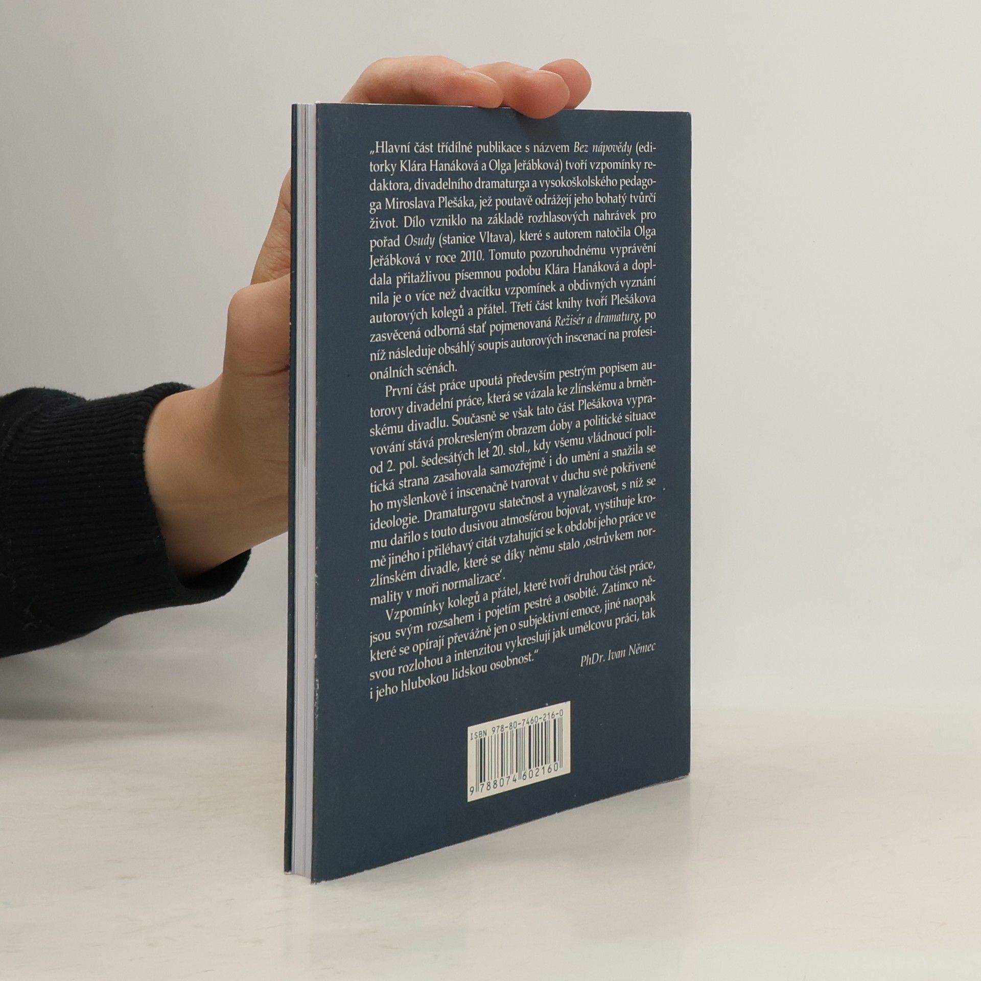 Třídílná publikace přibližuje osobnost Miroslava Plešáka (1943-2021), redaktora, dramaturga a pedagoga. Hlavní část tvoří jeho vzpomínky, které s ním natočila Olga Jeřábková a byly odvysílány v roce 2010 v rozhlasovém pořadu Osudy. Tyto vzpomínky jsou doplněny poznámkami, které mladší generaci přibližují méně známé osobnosti a historické okolnosti. Plešák vzpomíná na rodné město Bzenec, středoškolská studia v Kroměříži a Moravské Nové Vsi, kde se posléze přestěhovali. Zamýšlí nad vztahem k Brnu, vzpomíná na studium a učitele na Filosofické fakultě UJEP, a na začátky literárního časopisu Host do domu a Index, který pomáhal založit. Další vyprávění se věnuje normalizaci a zlínskému divadlu, kde působil jako dramaturg, a jeho působení na JAMU, včetně zákulisí vzniku divadelní fakulty. Druhá část obsahuje vzpomínky kolegů, přátel a studentů, kteří sdílejí zážitky ze setkání a spolupráce s Plešákem. Mezi přispěvateli jsou I. Bareš, V. Cejpek a M. Uhde. Knihu uzavírá Plešákova studie Režisér a dramaturg a soupis jeho inscenací na profesionálních scénách.
