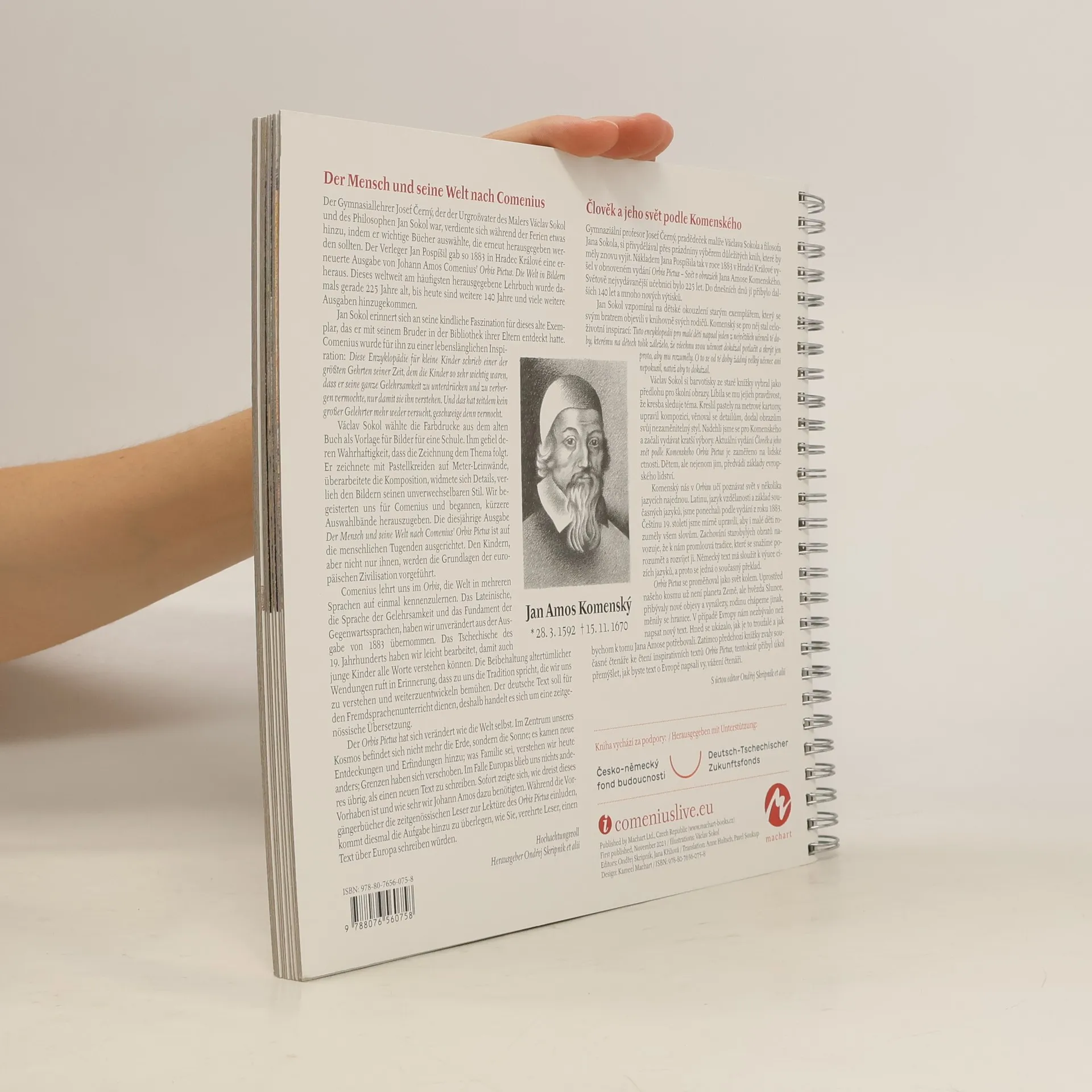 Aktuální výbor z unikátní obrazové učebnice Jana Amose Komenského, doplněný novými ilustracemi Václava Sokola, přibližuje svět v obrazech současným dětským čtenářům. Publikace se zaměřuje na témata shrnutá pod názvem „Člověk a jeho svět“ a obsahuje modernizované české texty, aktuální německý překlad a originální latinu. Kniha tak splňuje původní záměr autora, otevírat mladým čtenářům okno do světa cizích jazyků. Vydání navazuje na předchozí tituly a obsahuje zásadní myšlenky o lidských ctnostech, které představují základy evropského lidství. Komenský v Orbisu učí poznávat svět v několika jazycích, a proto byl latinský text zachován podle vydání z roku 1883, zatímco čeština byla mírně upravena pro lepší srozumitelnost. Německý text slouží k výuce cizích jazyků. Orbis Pictus se vyvíjel stejně jako svět kolem nás; v současnosti je středem našeho kosmu Slunce a mění se chápání rodiny a hranic. Nový text o Evropě ukazuje, jak je důležité přemýšlet o tom, jak bychom my, čtenáři, napsali vlastní verzi. Tato publikace nejen inspiruje k četbě, ale také vybízí k zamyšlení nad evropským dědictvím a tradicemi.