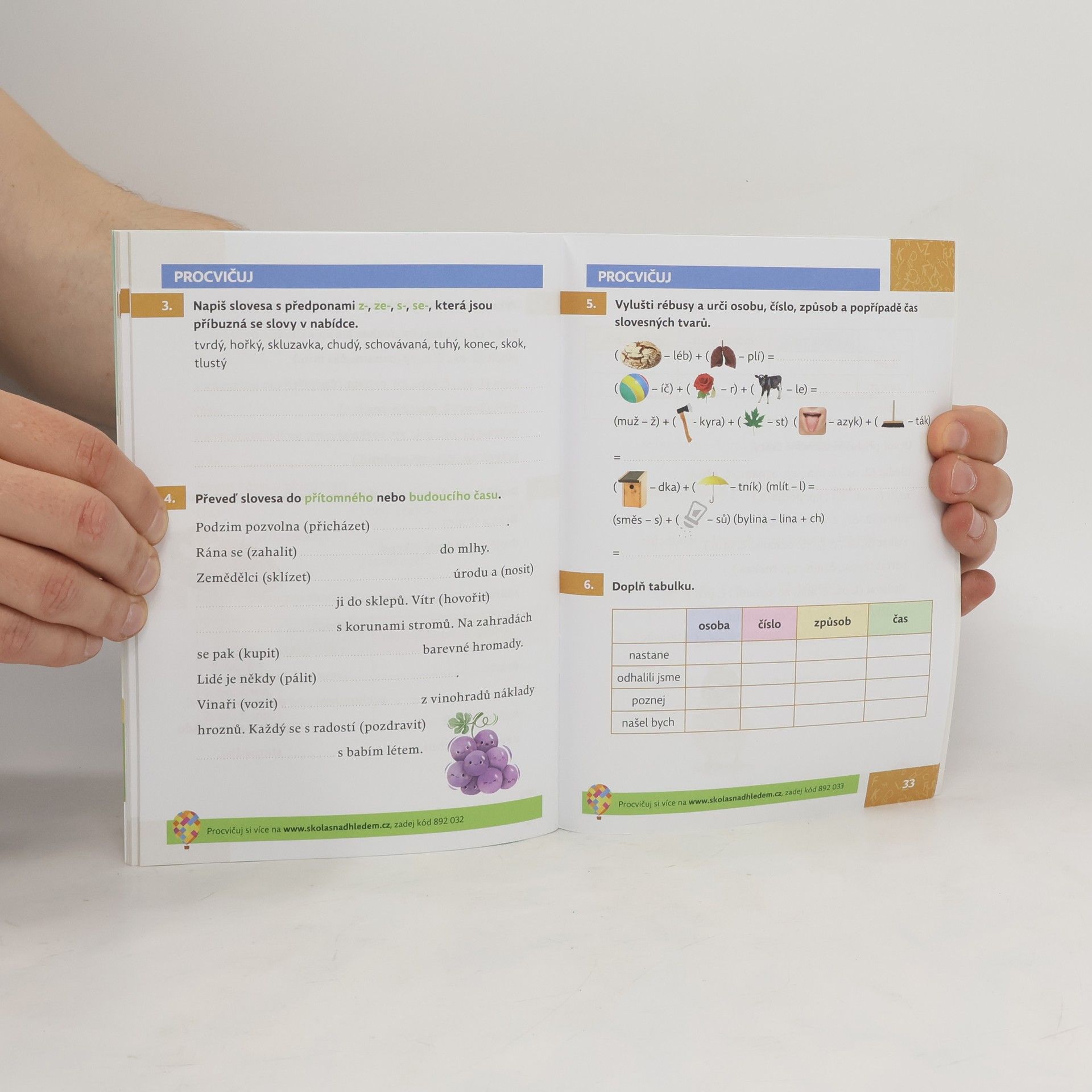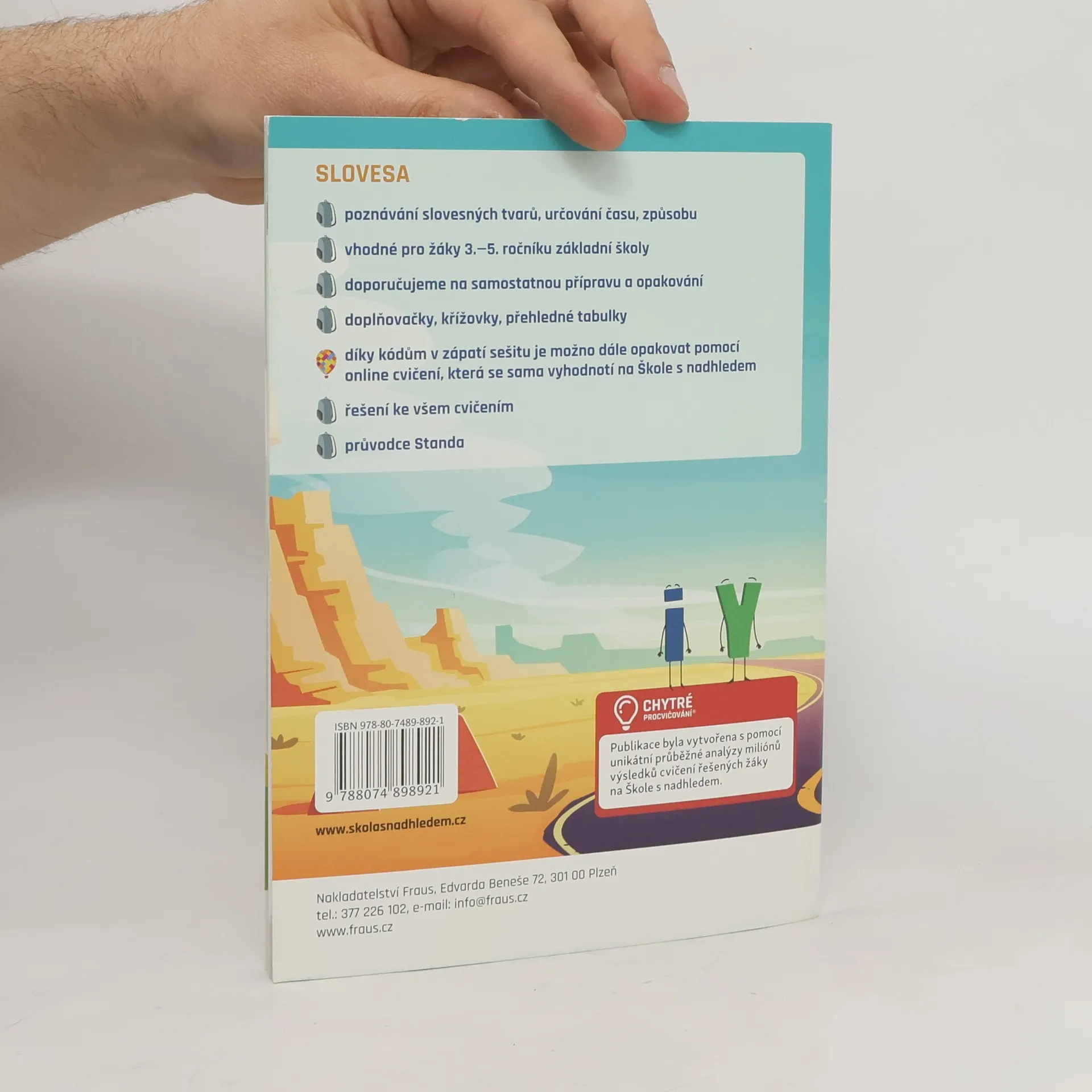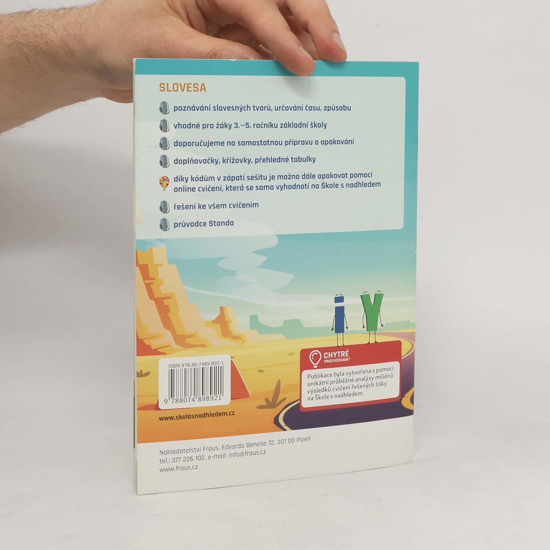Tento sešitek je zaměřen na poznávání slovesných tvarů, určování času a způsobu. Děti si slovesa procvičí pomocí různých doplňovaček a křížovek a navíc získají přehledné tabulky s problematickými jevy, k nimž se mohou vždy vracet. Součástí sešitu je samozřejmě i klíč s řešením ke všem cvičením. Navíc díky kódům v zápatí sešitu mohou dále procvičovat pomocí online cvičení, která se sama vyhodnotí na Škole s nadhledem. Sešitek s názvem „SLOVESA“ je určen pro žáky 3.—5. ročníku základní školy a nabízí řadu procvičovacích cvičení, která pomáhají překonat složité období zdokonalování obtížných jevů v českém jazyce. Je to jeden z řady procvičovacích sešitů „Edice Školy s nadhledem“ s podtitulem „Standovy deníky z cest“. Celou touto řadou děti provází oblíbený maskot Standa Balón a jeho sestra Viky. V kresleném komiksu pak dětem vysvětlují, proč je důležité umět česky a ovládat matematiku. Jak už název napovídá, tento sešitek je zaměřen na poznávání slovesných tvarů, určování času a způsobu. Děti si slovesa procvičí pomocí různých doplňovaček a křížovek a navíc získají přehledné tabulky s problematickými jevy, k nimž se mohou vždy vracet. Součástí sešitu je samozřejmě i klíč s řešením ke všem cvičením. Navíc díky kódům v zápatí sešitu mohou dále procvičovat pomocí online cvičení, která se sama vyhodnotí, na www.skolasnadhledem.cz. Sešit je vhodný pro samostatnou přípravu a opakování.