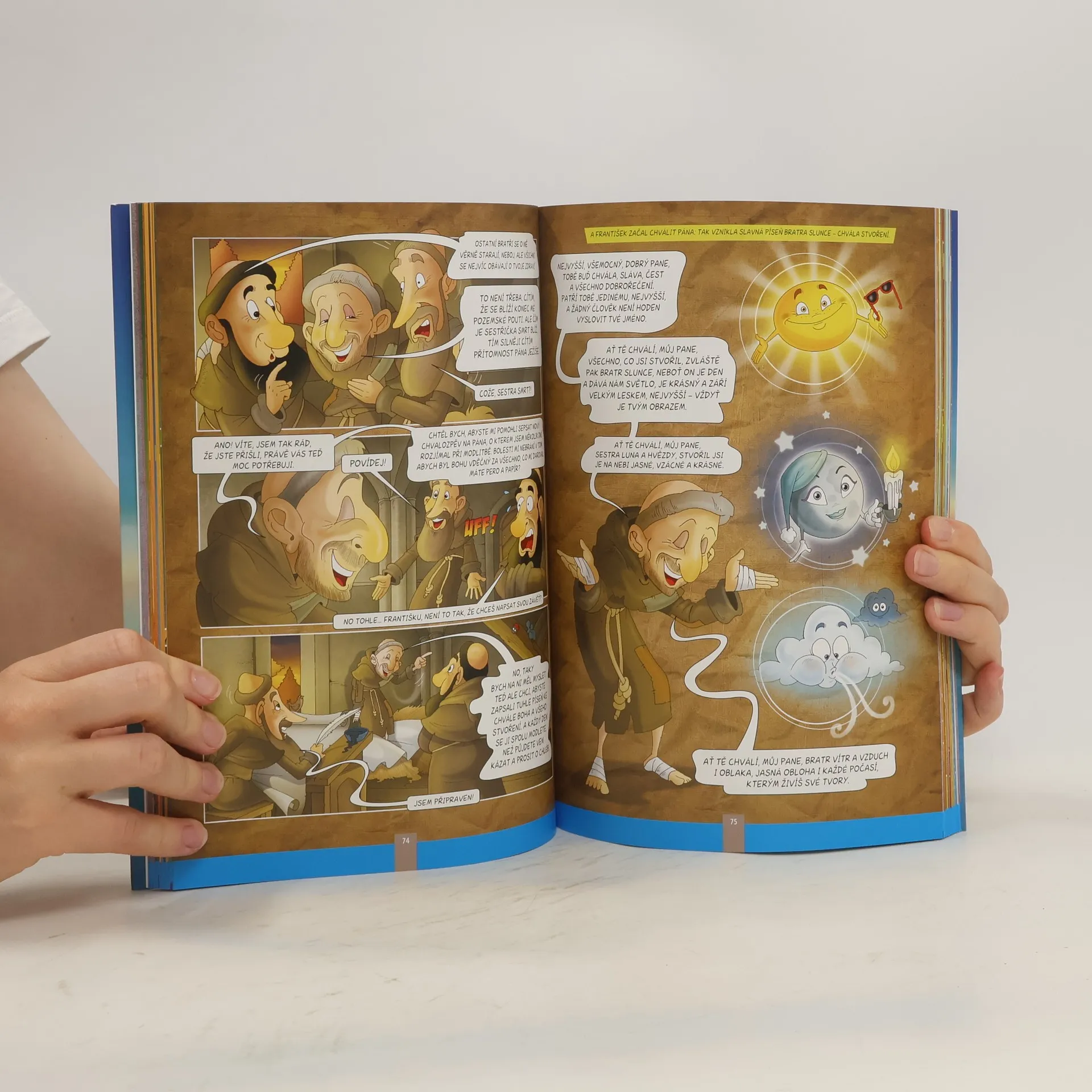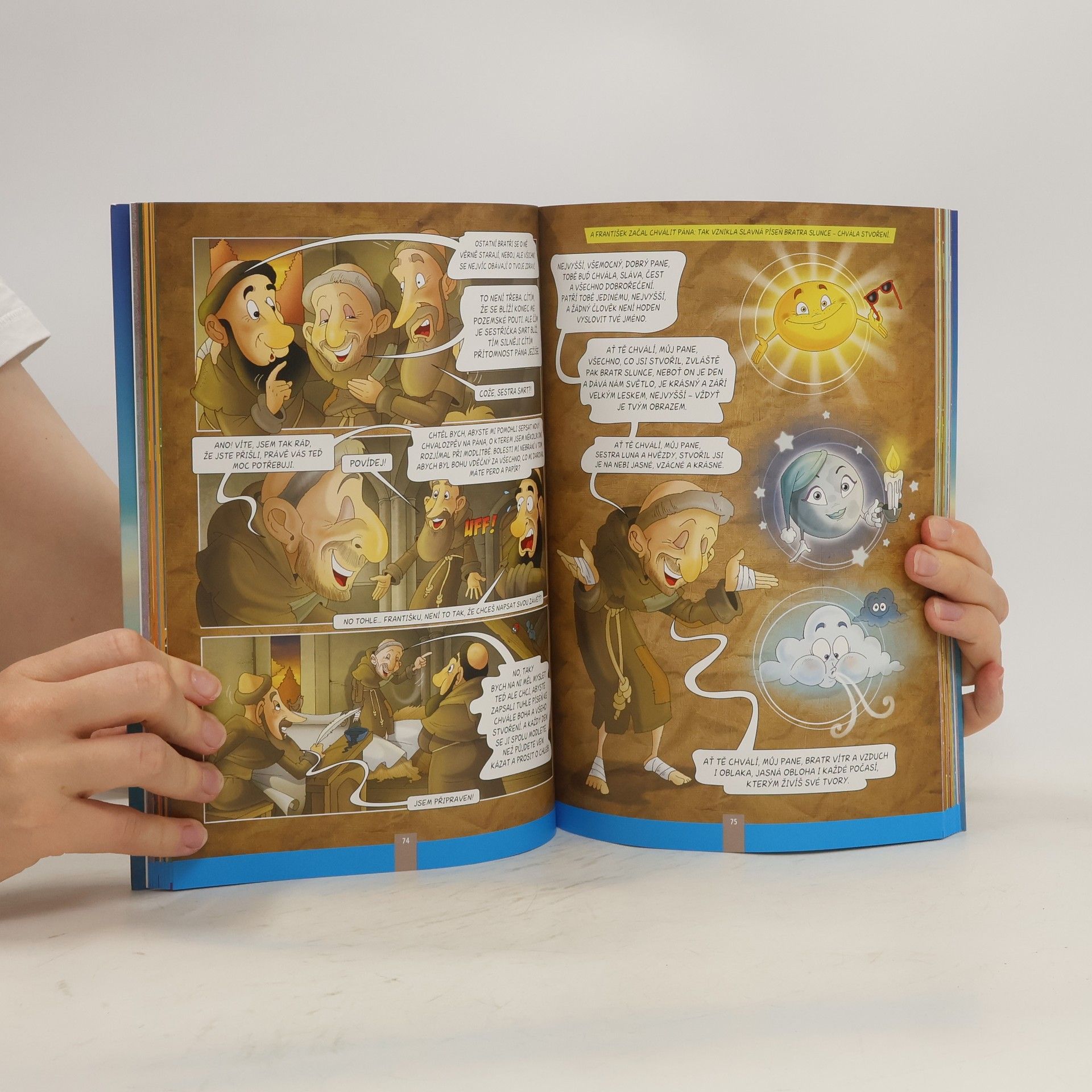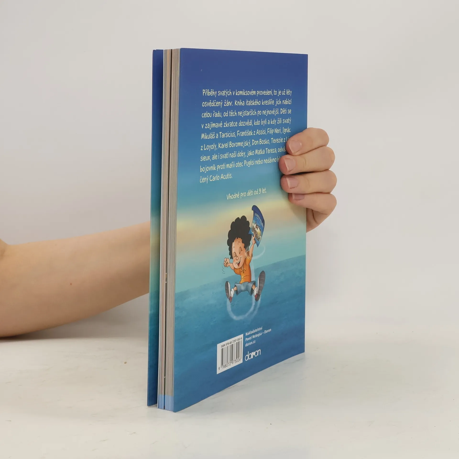 Příběhy svatých v komiksovém provedení je už léty osvědčený žánr. Kniha italského kreslíře jich nabízí celou řadu, od těch nejstarších po nejnovější. Děti se v zajímavé zkratce dozvědí, kdo byli a kdy žili svatý Mikuláš a Tarsicius, František z Assisi, Filip Neri, Ignác z Loyoly, Karel Boromejský, Don Bosco, Terezie z Lisieux, ale i svatí naší doby jako Matka Tereza, odvážný bojovník proti mafii otec Puglisi nebo nedávno blahořečený Carlo Acutis.