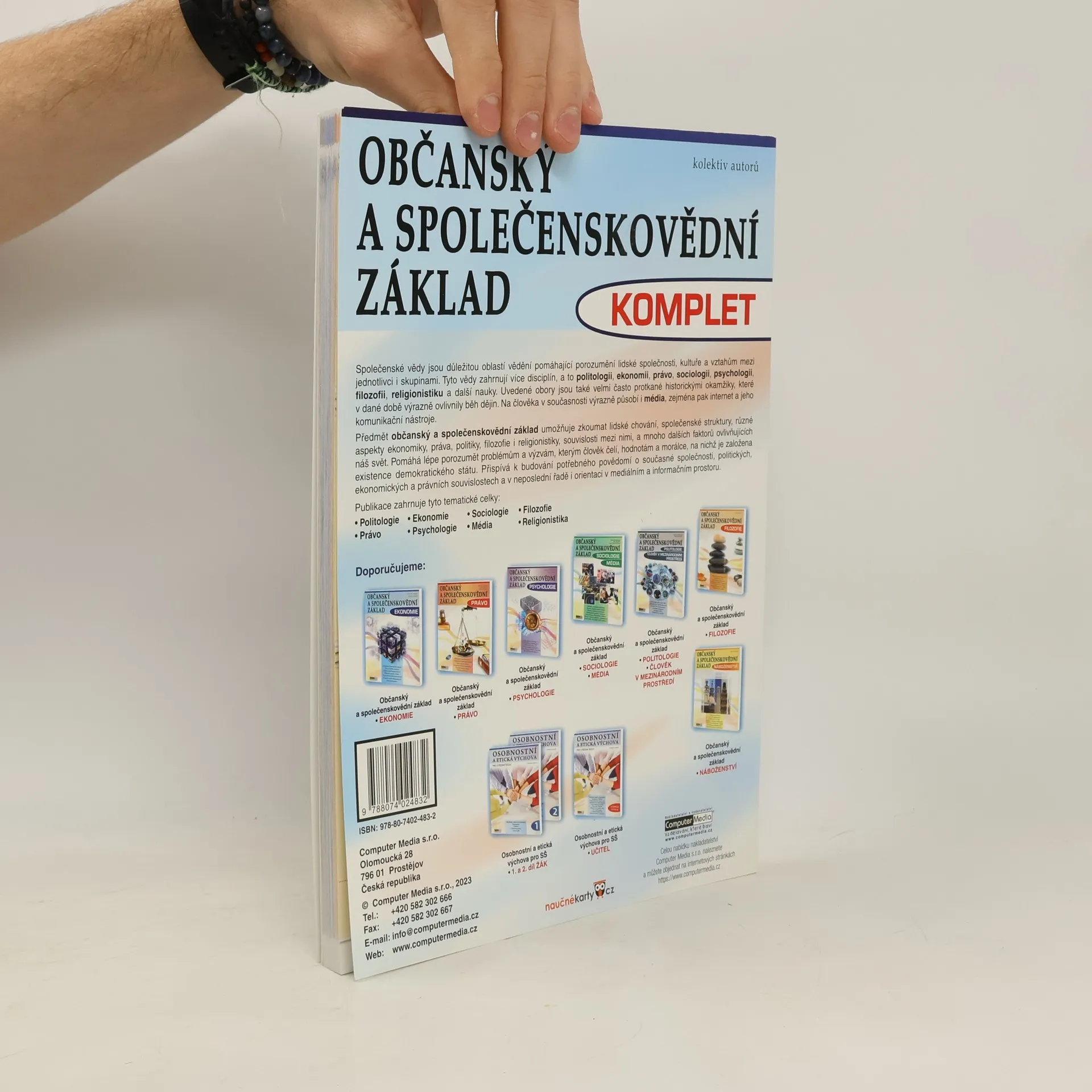 Učebnice Občanský a společenskovědní základ - KOMPLET v jediné knize pokrývá kompletní učivo tohoto předmětu. Plně odpovídá požadavkům RVP MŠMT. Je ideálním materiálem pro přípravu k maturitě. Obsahuje aktuální informace, je vizuálně atraktivně zpracovaná, srozumitelná a přehledná. Text je doplněn o velké množství názorných schémat, mapek, obrázků, grafů, tipů, zajímavostí a souvislostí. Učebnice navíc nabízí odkazy na doplňující informace formou QR kódů pro mobilní telefon. Studenti tak mohou k jednotlivým tématům okamžitě získat například související videa nebo další informační zdroje. Studium se díky tomu stává přitažlivější a zajímavější. Publikace zahrnuje tyto tematické celky: Politologie Právo Ekonomie Psychologie Sociologie Média Filozofie Religionistika