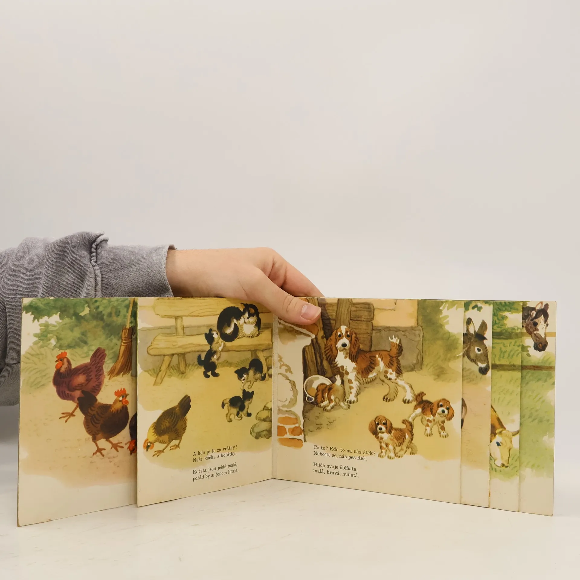 Sestupně vrstvené leporelo s kouzelnými ilustracemi Antonína Pospíšila a s krátkými básničkami o domácích zvířatech.