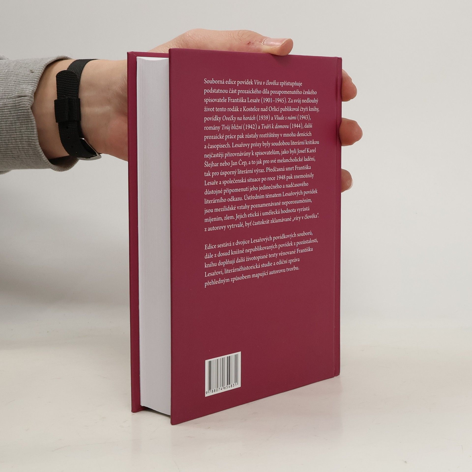 Souborná edice povídek Víra v člověka zpřístupňuje podstatnou část prozaického díla pozapomenutého českého spisovatele Františka Lesaře (1901–1945). Za svůj nedlouhý život tento rodák z Kostelce nad Orlicí publikoval čtyři knihy, povídky Ovečky na horách (1939) a Všude s námi (1943), romány Tvůj bližní (1942) a Tváří k domovu (1944), další prozaické práce pak zůstaly roztříštěny v mnoha denících a časopisech. Lesařovy prózy byly soudobou literární kritikou nejčastěji přirovnávány k spisovatelům, jako byli Josef Karel Šlejhar nebo Jan Čep, a to jak pro své melancholické ladění, tak pro úsporný literární výraz. Předčasná smrt Františka Lesaře a společenská situace po roce 1948 pak znemožnily důstojné připomenutí jeho jedinečného a nadčasového literárního odkazu. Ústředním tématem Lesařových povídek jsou mezilidské vztahy poznamenávané neporozuměním, míjením, zlem. Jejich etická i umělecká hodnota vyrůstá z autorovy vytrvalé, byť častokrát zklamávané „víry v člověka“. Edice sestává z dvojice Lesařových povídkových souborů, dále z dosud knižně nepublikovaných povídek z pozůstalosti, knihu doplňují další životopisné texty věnované Františku Lesařovi, literárněhistorická studie a ediční zpráva přehledným způsobem mapující autorovu tvorbu.