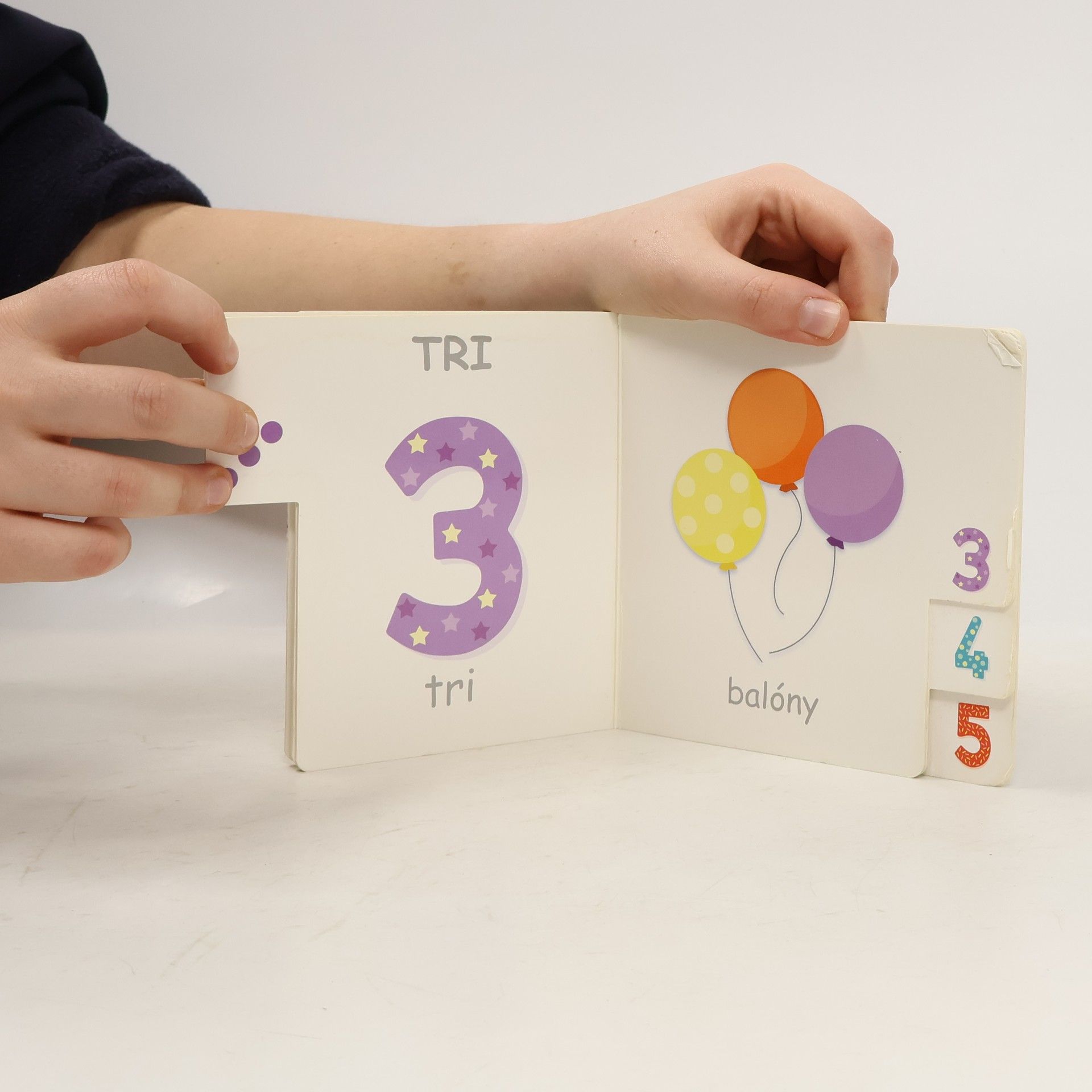 Vzdelávacie leporelo, ktoré si deti hneď obľúbia. Jednoduché veľké obrázky predmetov im pomôžu naučiť sa základné čísla od 1 do 5. Podľa počtu predmetov na ilustrácii sa neskôr môžu naučiť počítať jednotlivé predmety.