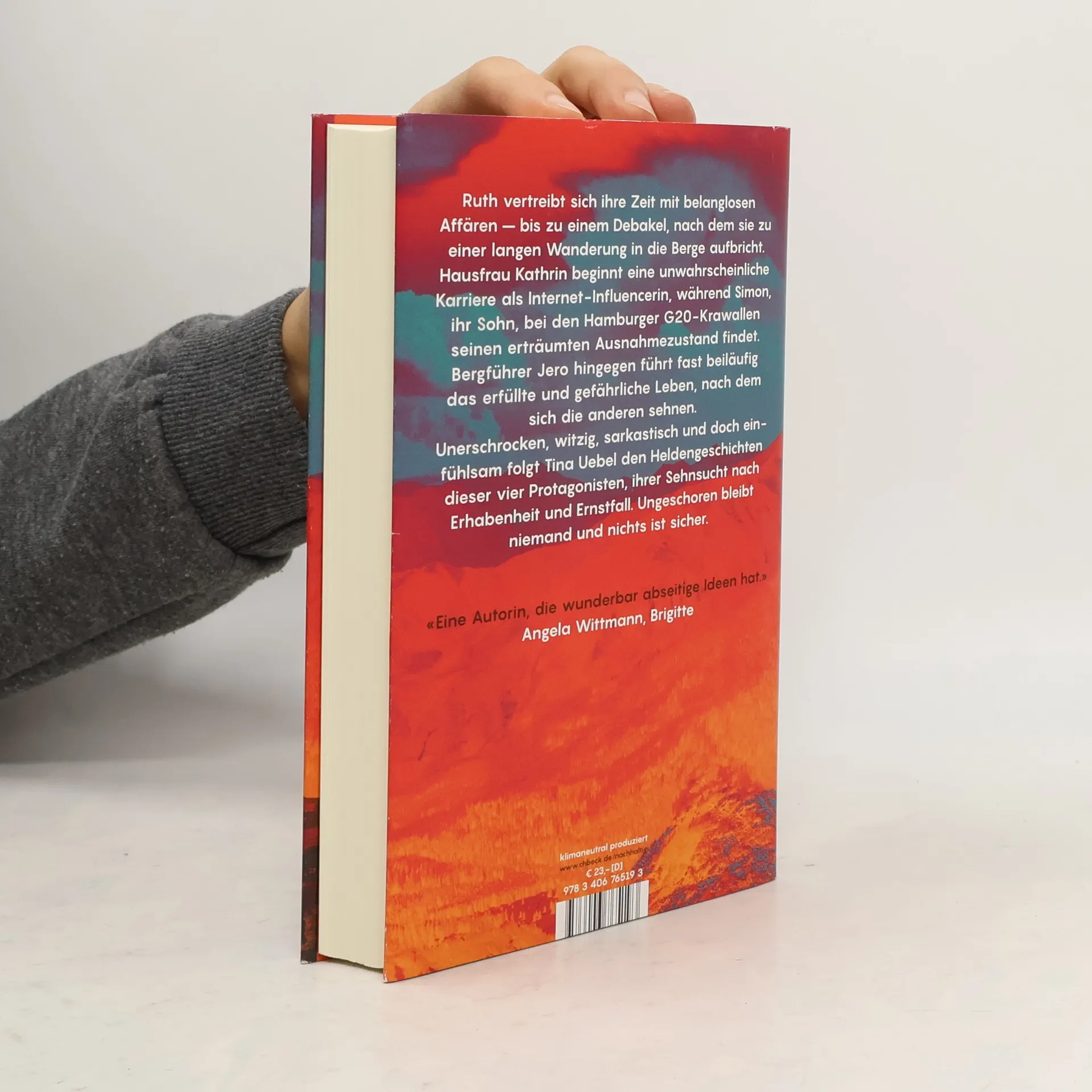 Ruth, alleinstehend, wohlhabend und nicht mehr jung, vertreibt sich ihre Zeit mit belanglosen Affären. Als einer ihrer Liebhaber sie für ein Wochenendseminar in die Schweiz einlädt, bei einem Glücks-Guru der fragwürdigeren Sorte, wecken die Berge in ihr eine Sehnsucht nach Erhabenheit, Herausforderung und Gefahr, und sie bricht zu einer langen Wanderung auf. Kathrin hingegen, kaum jünger als Ruth, Hausfrau und verheiratet, stürzt sich Hals über Kopf in die Heilslehren und Erfolgsversprechen dieser Seminare und beginnt eine unwahrscheinliche Karriere als Internet Influencerin. Simon, ihr siebzehnjähriger Sohn, der das wahre Leben außerhalb seiner Heimatstadt Hannover sucht, findet schließlich in der Julihitze bei den Hamburger G20-Krawallen den Ausnahmezustand, den er sich immer erhofft hat. Jero, der vierte im Bunde, ist Bergführerin der dramatisch schönen Bergwelt der Schweiz. Er führt fast beiläufig das intensive, erfüllte und gefährliche Leben, nach dem sich die anderen sehnen. Ruth wird ihn für eine herausfordernde Bergtour engagieren. In ihrem neuen Roman folgt Tina Uebel unerschrocken, witzig, sarkastisch, aber auch einfühlsam den Heldengeschichten dieser vier Protagonisten, die einem mit ihren Ängsten und Sehnsüchten schnell ans Herz wachsen. Ungeschoren bleibt hier niemand und nichts ist sicher.