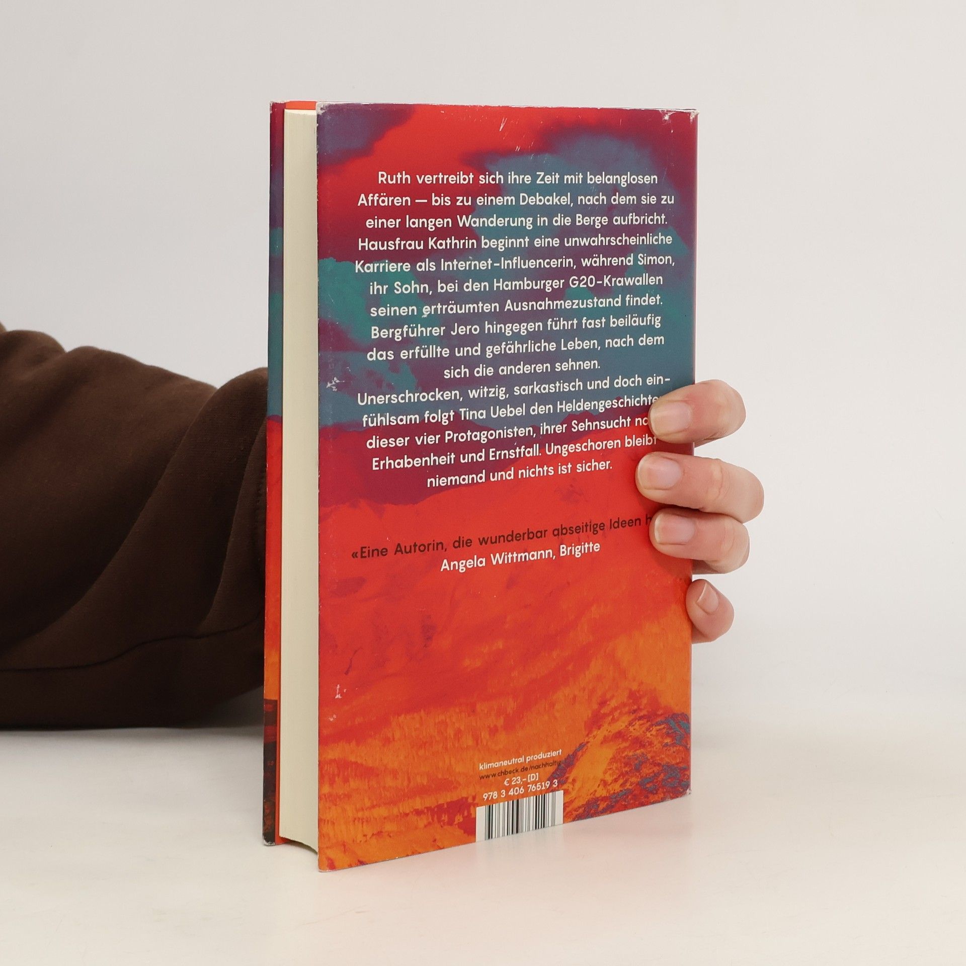 Ruth, alleinstehend, wohlhabend und nicht mehr jung, vertreibt sich ihre Zeit mit belanglosen Affären. Als einer ihrer Liebhaber sie für ein Wochenendseminar in die Schweiz einlädt, bei einem Glücks-Guru der fragwürdigeren Sorte, wecken die Berge in ihr eine Sehnsucht nach Erhabenheit, Herausforderung und Gefahr, und sie bricht zu einer langen Wanderung auf. Kathrin hingegen, kaum jünger als Ruth, Hausfrau und verheiratet, stürzt sich Hals über Kopf in die Heilslehren und Erfolgsversprechen dieser Seminare und beginnt eine unwahrscheinliche Karriere als Internet Influencerin. Simon, ihr siebzehnjähriger Sohn, der das wahre Leben außerhalb seiner Heimatstadt Hannover sucht, findet schließlich in der Julihitze bei den Hamburger G20-Krawallen den Ausnahmezustand, den er sich immer erhofft hat. Jero, der vierte im Bunde, ist Bergführerin der dramatisch schönen Bergwelt der Schweiz. Er führt fast beiläufig das intensive, erfüllte und gefährliche Leben, nach dem sich die anderen sehnen. Ruth wird ihn für eine herausfordernde Bergtour engagieren. In ihrem neuen Roman folgt Tina Uebel unerschrocken, witzig, sarkastisch, aber auch einfühlsam den Heldengeschichten dieser vier Protagonisten, die einem mit ihren Ängsten und Sehnsüchten schnell ans Herz wachsen. Ungeschoren bleibt hier niemand und nichts ist sicher.