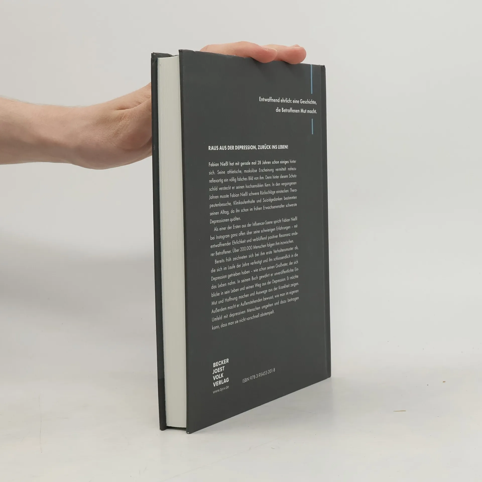 Raus aus den Depressionen, zurück ins LebenFabian Nießl hat mit gerade mal 28 Jahren schon einiges hinter sich. Seine athletische, muskulöse Erscheinung vermittelt nahezu reflexartig ein völlig falsches Bild von ihm. Denn hinter diesem Schutzschild versteckt er seinen hochsensiblen Kern. In den vergangenen Jahren musste Fabian Nießl schwere Rückschläge einstecken: Therapeutenbesuche, Klinikaufenthalte und Suizidgedanken bestimmten seinen Alltag, da ihn schon im frühen Erwachsenenalter schwerste Depressionen quälten. Als einer der Ersten aus der Influencer-Szene spricht Fabian Nießl bei Instagram ganz offen über seine schwierigen Erfahrungen – mit entwaffnender Ehrlichkeit und verblüffend positiver Resonanz anderer Betroffener. Über 200.000 Menschen folgen ihm inzwischen.Bereits früh zeichneten sich bei ihm erste Verhaltensmuster ab, die sich im Laufe der Jahre verfestigt und ihn schlussendlich in die Depression getrieben haben – wie schon seinen Großvater, der sich das Leben nahm. In seinem Buch gewährt er unveröffentlichte Einblicke in sein Leben und seinen Weg aus der Depression. Er möchte Mut und Hoffnung machen und Auswege aus der Krankheit zeigen. Außerdem macht er Außenstehenden bewusst, wie man im eigenen Umfeld mit depressiven Menschen umgehen und dazu beitragen kann, dass man sie nicht vorschnell abstempelt.