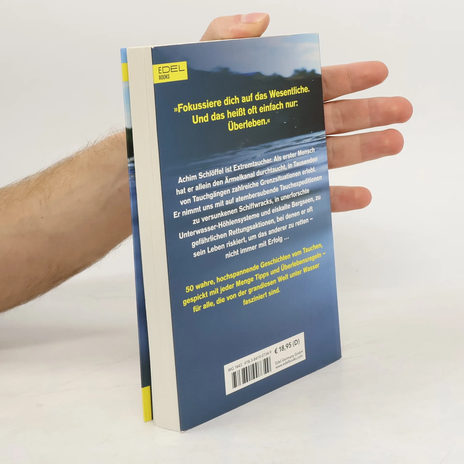 Achim Schlöffel ist Extremtaucher. Als erster Mensch hat er allein den Ärmelkanal durchtaucht, in Tausenden von Tauchgängen zahlreiche Grenzsituationen erlebt. In 50 hochspannenden Berichten erklärt er den Sog der Tiefe und den richtigen Umgang mit der Angst, erzählt von seinen aufregendsten und gefährlichsten, aber auch schönsten Erlebnissen in der faszinierenden Welt unter Wasser. Er nimmt uns mit auf atemberaubende Tauchexpeditionen zu versunkenen Schiffwracks, in unerforschte Unterwasser-Höhlensysteme und eiskalte Bergseen, zu gefährlichen Rettungsaktionen, bei denen er mehrfach sein Leben riskiert, um das anderer zu retten – nicht immer mit Erfolg. Dazu liefert der Tauchprofi eine Menge Tipps für ambitionierte Hobbytaucher, u.a. seine spektakulärsten Wracks, Höhlen und Tauchplätze, sowie die wichtigsten zehn Überlebensregeln. Eine der ersten: Zwischen „Ich kann nicht mehr“ und „Es geht nicht mehr“ ist immer noch genug Luft, um weiterzumachen.