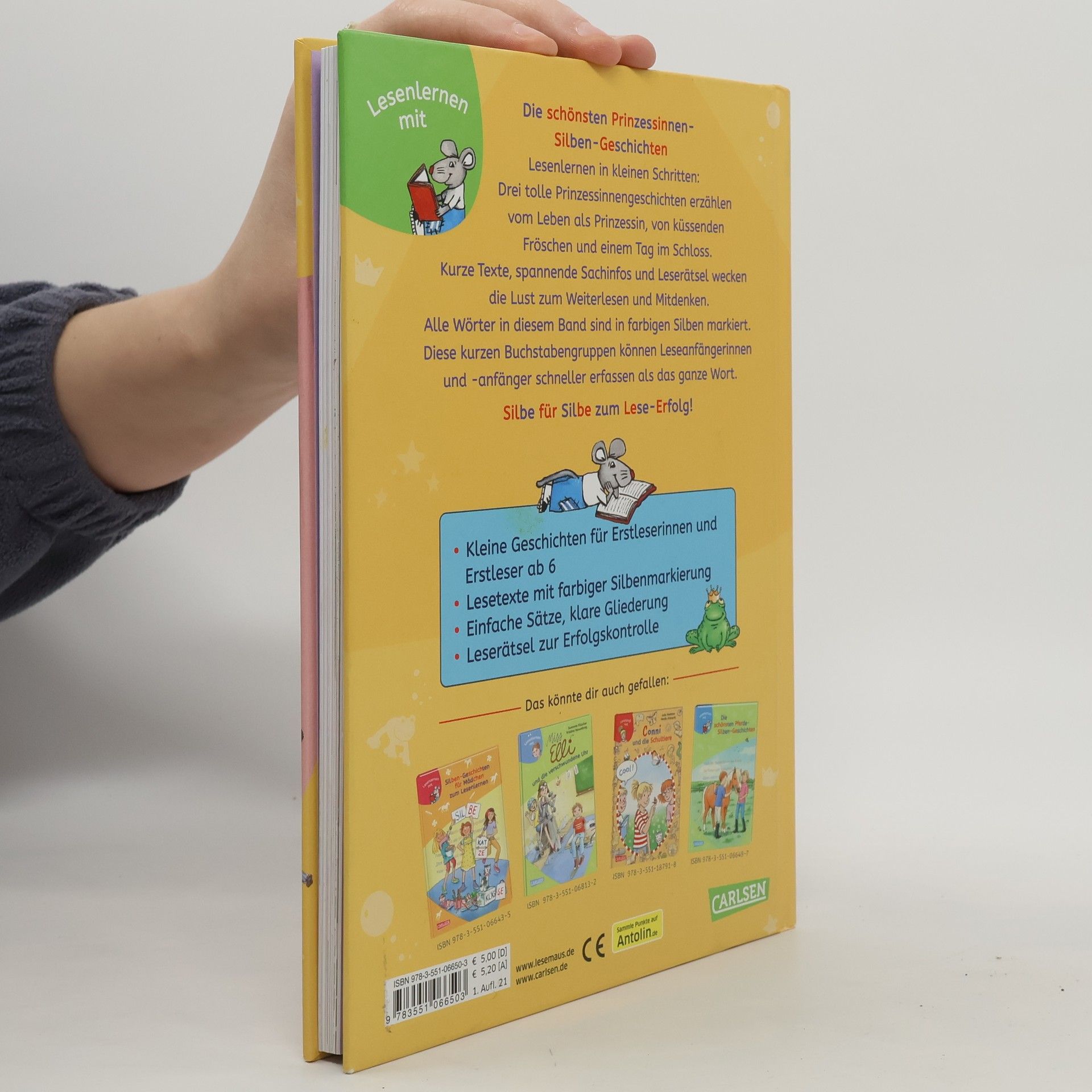 Drei tolle Prinzessinnengeschichten für Leseanfänger*innen erzählen vom Leben als Prinzessin, küssenden Fröschen und einem Tag im Schloss. Alle Wörter in diesem Band sind in farbigen Silben markiert. Diese kurzen Buchstabengruppen können Leseanfänger*innen schneller erfassen als das ganze Wort. Kurze Texte, spannende Sachinfos und Leserätsel wecken die Lust zum Weiterlesen und Mitdenken. Enthält folgende Geschichten: Conni und die Prinzessin Marie küsst einen Frosch Ein Tag im Schloss LESEMAUS zum LESENLERNEN – die Reihe für Erstleser! Spannende und leichte Geschichten für Jungs und Mädchen, lustige Leserätsel und kindgerechte Sachinfos motivieren Leseanfänger zum Weiterlesen und Mitdenken.