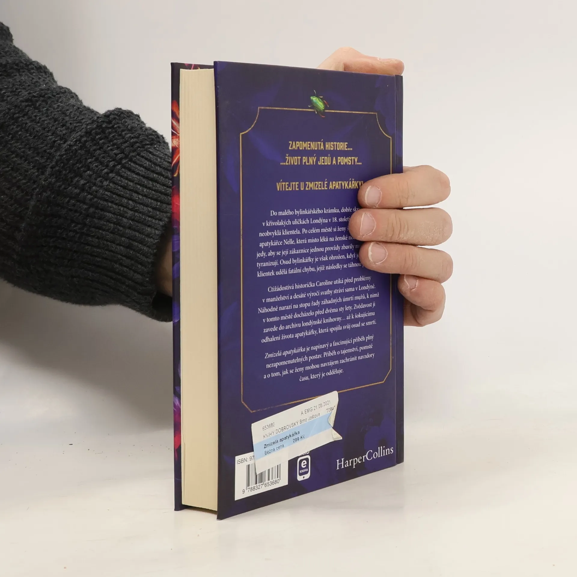 Do malého bylinkářského krámku, dobře skrytého v křivolakých uličkách Londýna v 18. století, míří vskutku neobvyklá klientela. Po celém městě si ženy šeptají o záhadné apatykářce Nelle, která místo léků na ženské neduhy prodává jedy, aby se její zákaznice jednou provždy zbavily mužů, kteří je tyranizují. Osud bylinkářky je však ohrožen, když jedna z jejích klientek udělá fatální chybu, jejíž následky se táhnou po staletí. Ctižádostivá historička Caroline utíká před problémy v manželství a desáté výročí svatby stráví sama v Londýně. Náhodně narazí na stopu řady záhadných úmrtí mužů, k nimž v tomto městě docházelo před dvěma sty lety. Zvědavost ji zavede do archivu londýnské knihovny… až k šokujícímu odhalení života apatykářky, která spojila svůj osud se smrtí. Zmizelá apatykářka je napínavý a fascinující příběh plný nezapomenutelných postav. Příběh o tajemství, pomstě a o tom, jak se ženy mohou navzájem zachránit navzdory času, který je odděluje.