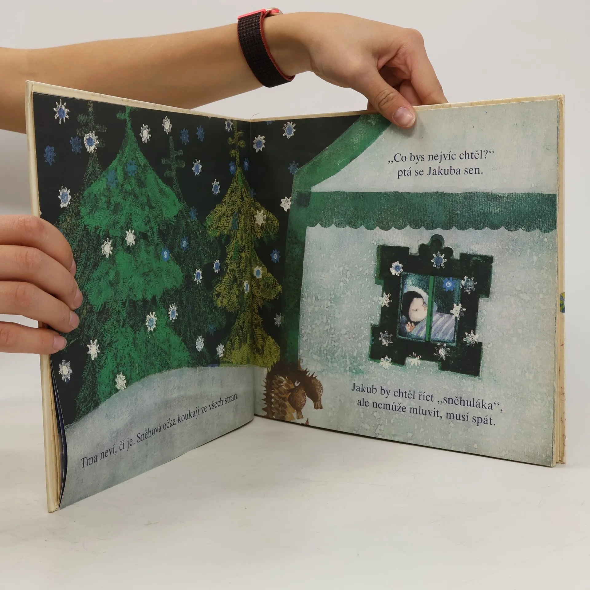 Obrázková kniha se snaží oslovit nejmenší děti ve věku od tří let. Fabuli příběhu, inspirovanou zážitky ze zasněžených zimních dnů a nocí, ukryla spisovatelka do několika motivů ztvárněných lyrizujícími jazykovými prostředky. Tak se autorce podařilo vnést do textu pravou atmosféru příchodu třpytivých vloček, jež vítají děti na prvních stránkách knihy a stávají se tak počátečním impulzem vedoucím ke kontaktu čtenářů s prostředím děje a hlavním hrdinou předškolákem Jakubem.