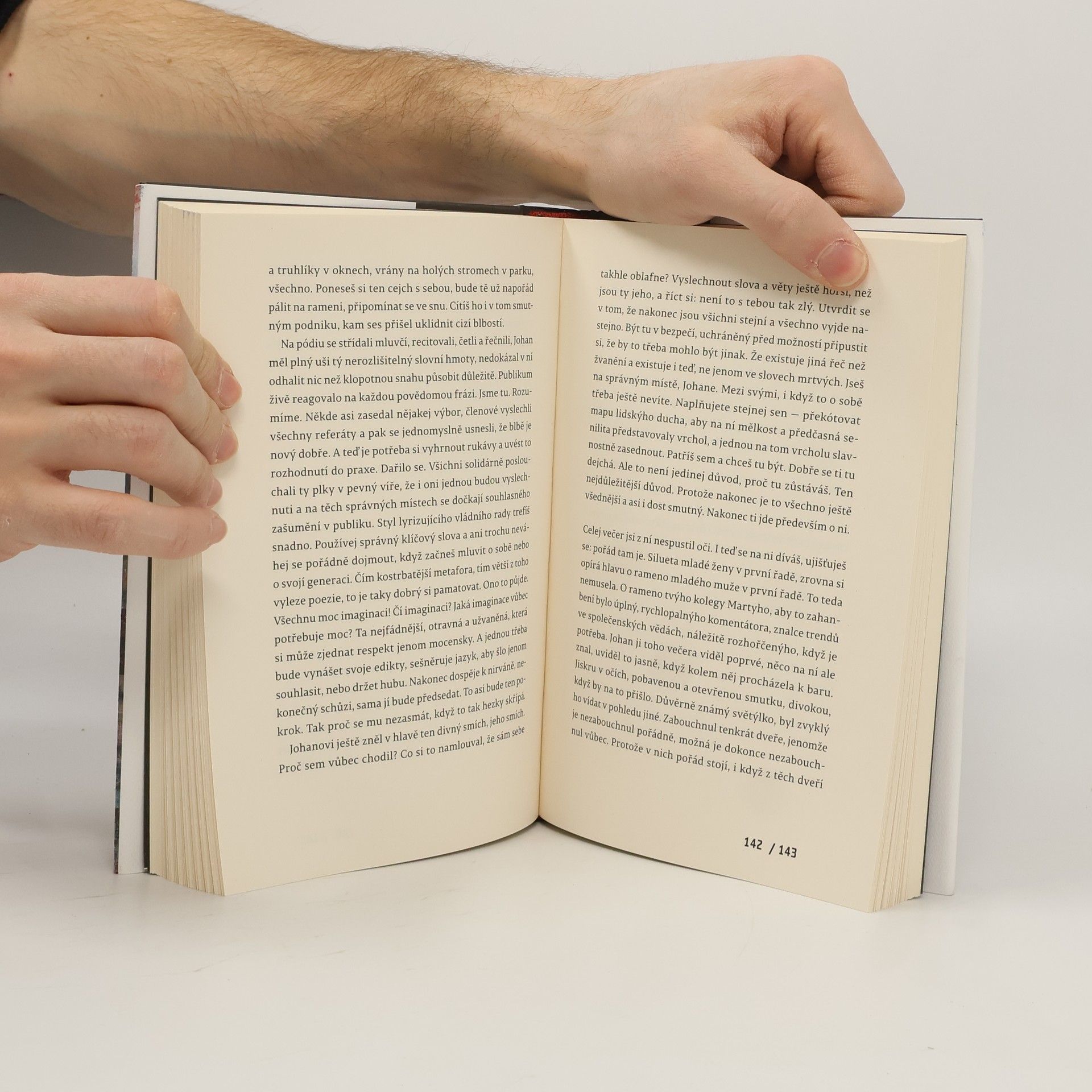 Česko, leden 2018. Prezident Miloš Zeman byl právě zvolen do druhého volebního období, venku mrzne, občanstvo si vylévá srdce na sociální sítě a v redakci nejmenovaného deníku nedobrovolně končí vyhořelý komentátor Jan „Johan“ Souček. Antihrdinou třetího románu Ondřeje Štindla lomcují bezmoc, vztek a strach – a když si pod svým článkem na webu přečte výsměšný komentář, udělá jedno nesmyslné, zoufalé rozhodnutí. Začíná temně groteskní příběh, v němž o sebe křísnou dva muži z opačných táborů společenského spektra a pak se začnou dít věci. Štindlův román se odvíjí na pomezí satiry, hororu, psychodramatu i road movie. Je možné v něm vidět surovou a stísňující karikaturu rozdělené společnosti. A také obraz existenciální krize, strachu z nicoty a touhy uniknout. Johanovu cestu určují narcismus a zahořklost, znechucení okolím i sebou samým. V jeho světě existuje jistota trapnosti a jen vzdálená možnost katarze. Štindl příběh svého antihrdiny zachycuje s neutuchající intenzitou a hodně zblízka; v Johanových výlevech nechává zaznívat deformované echo základních životních otázek, které ovšem ani v pokřivené podobě neztrácejí vážnost a význam. A z nich probleskuje i smutek člověka schopného jen „hýčkat si tu díru v srdci, to svoje studený místo“ a mučeného tušením, že to asi nestačí.