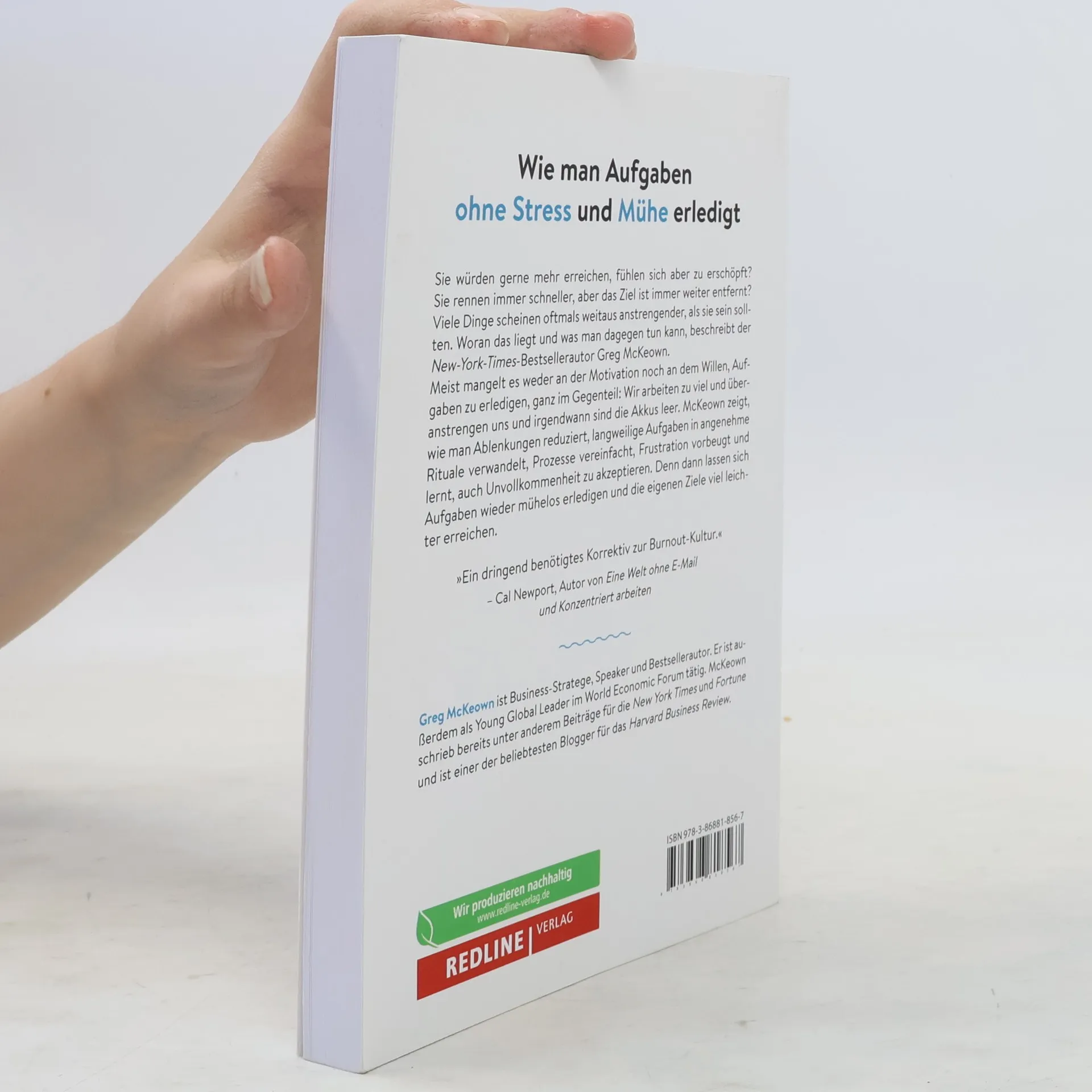 Wie man Aufgaben ohne Stress und Mühe erledigt Sie würden gerne mehr erreichen, fühlen sich aber zu erschöpft? Sie rennen immer schneller, aber das Ziel ist immer weiter entfernt? Viele Dinge scheinen oftmals weitaus anstrengender, als sie sein sollten. Woran das liegt und was man dagegen tun kann, beschreibt der New-York-Times-Bestsellerautor Greg McKeown. Meist mangelt es weder an der Motivation noch an dem Willen, Aufgaben zu erledigen, ganz im Gegenteil: Wir arbeiten zu viel und überanstrengen uns und irgendwann sind die Akkus leer. McKeown zeigt, wie man Ablenkungen reduziert, langweilige Aufgaben in angenehme Rituale verwandelt, Prozesse vereinfacht, Frustration vorbeugt und lernt, auch Unvollkommenheit zu akzeptieren. Denn dann lassen sich Aufgaben wieder mühelos erledigen und die eigenen Ziele viel leichter erreichen. »Ein dringend benötigtes Korrektiv zur Burnout-Kultur.« – Cal Newport, Autor von Eine Welt ohne E-Mail und Konzentriert arbeiten