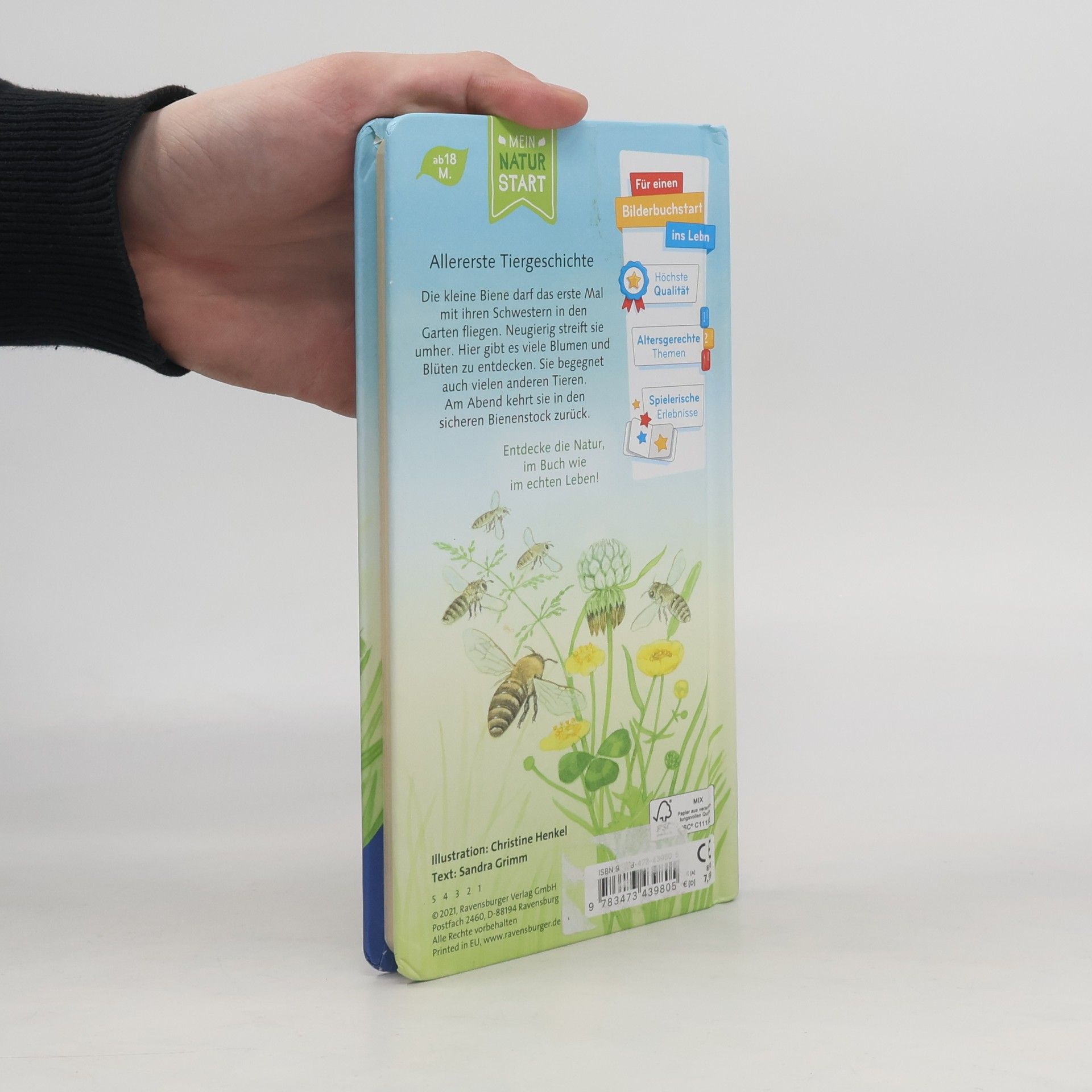 Für die kleine Biene ist heute ein besonderer Tag: Zum ersten Mal fliegt sie in den Garten, um Pollen und Nektar zu sammeln. Neugierig streift sie umher, entdeckt Blüten und viele andere Insekten wie Schmetterlinge oder Hummeln. Von den Wespen sollte sie aber lieber Abstand halten! Eine liebevolle Vorlesegeschichte mit einfachem Text für kleine Naturentdecker Die kleine Biene fliegt heute das erste Mal hinaus in den Garten. Zusammen mit ihrer Schwestern will sie Pollen sammeln. Natürlich gibt es auf diesem ersten Ausflug sehr viel zu entdecken. Und nicht alle Insekten wollen nur spielen. Aber unsere kleine Biene entkommt auch den gefährlichen Wespen. Im Bienenstock bei Ihren Schwestern ist die kleine Biene aber sicher und kann sich nach dem anstrengenden Abenteuer ausruhen.Die liebevolle Vorlesegeschichte mit ihrem einfachen Text eignet sich ideal zum Vorlesen schon für Babys ab 18 Monaten.Die realistischen Illustrationen sind Anlass die Natur im eigenen Garten oder im Blumenkasten am Fenster zu entdecken.