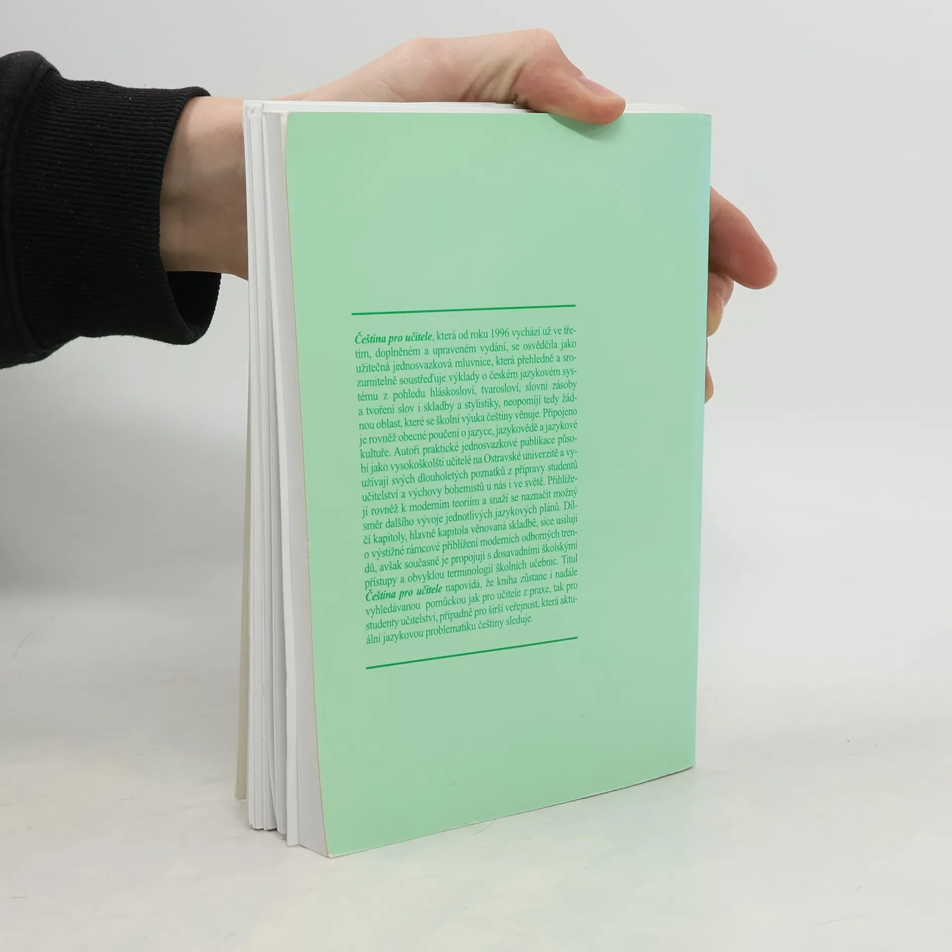 Čeština pro učitele, která od roku 1996 vychází už ve čtvrtém, doplněném a upraveném vydání, se osvědčila jako užitečná jednosvazková mluvnice, která přehledně soustřeďuje stěžejní výklady o českém jazykovém systému z pohledu hláskosloví, tvarosloví, slovní zásoby a tvoření slov i skladby a stylistiky, neopomíjí tedy žádnou oblast, které se školní výuka češtiny věnuje. Připojeno je obecné poučení o jazyce, jazykovědě a jazykové kultuře.