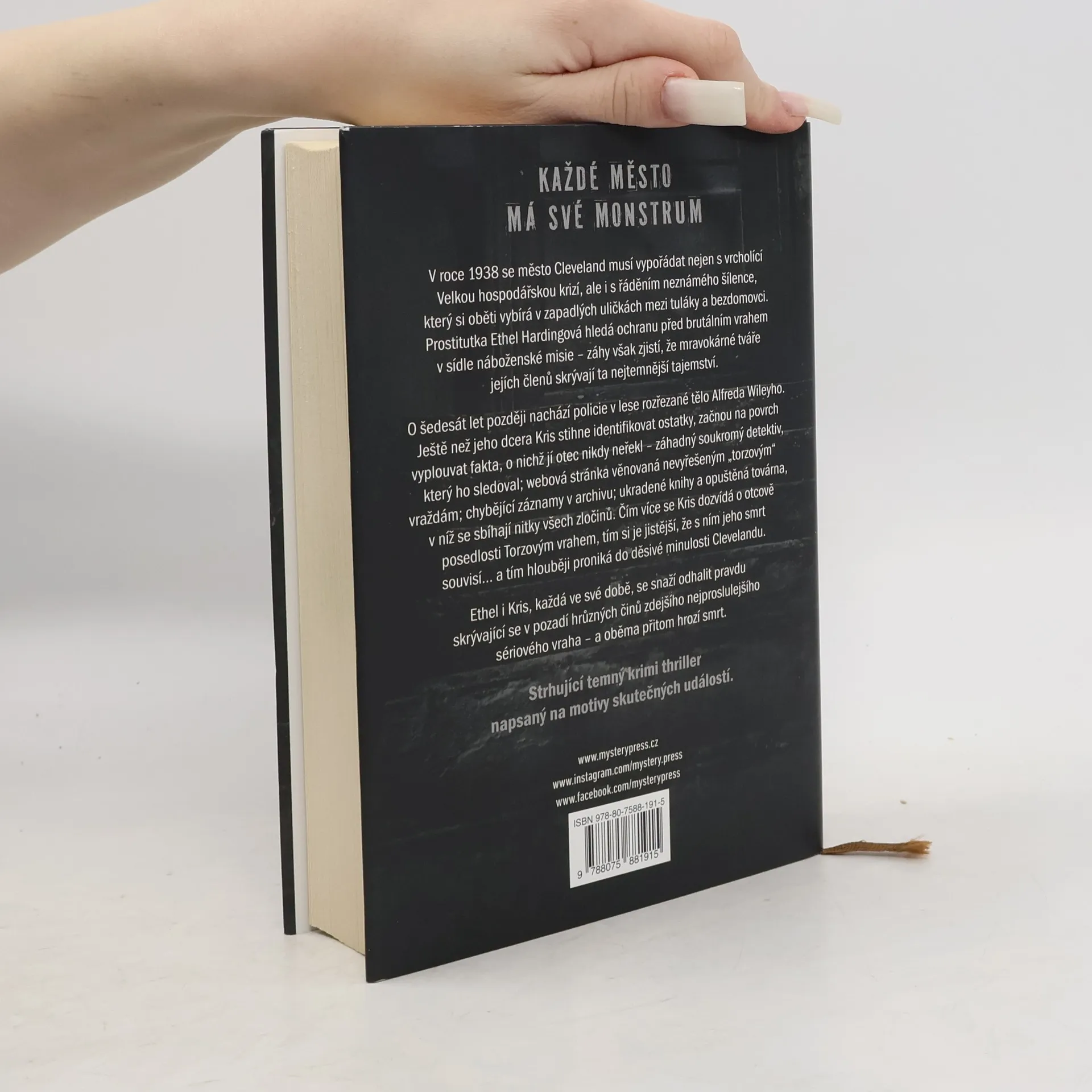 KAŽDÉ MĚSTO MÁ SVÉ MONSTRUM… V roce 1938 se město Cleveland musí vypořádat nejen s vrcholící Velkou hospodářskou krizí, ale i s řáděním neznámého šílence, který si oběti vybírá v zapadlých uličkách mezi tuláky a bezdomovci. Prostitutka Ethel Hardingová hledá ochranu před brutálním vrahem v sídle náboženské misie – záhy však zjistí, že mravokárné tváře jejích členů skrývají ta nejtemnější tajemství. O šedesát let později nachází policie v lese rozřezané tělo Alfreda Wileyho. Ještě než jeho dcera Kris stihne identifikovat ostatky, začnou na povrch vyplouvat fakta, o nichž jí otec nikdy neřekl – záhadný soukromý detektiv, který ho sledoval; webová stránka věnovaná nevyřešeným „torzovým“ vraždám; chybějící záznamy v archivu; ukradené knihy a opuštěná továrna, v níž se sbíhají nitky všech zločinů. Čím více se Kris dozvídá o otcově posedlosti Torzovým vrahem, tím si je jistější, že s ním jeho smrt souvisí – a tím hlouběji proniká do děsivé minulosti Clevelandu. Ethel i Kris, každá ve své době, se snaží odhalit pravdu skrývající se v pozadí hrůzných činů zdejšího nejproslulejšího sériového vraha – a oběma přitom hrozí smrt. ______ Strhující temný krimi thriller napsaný na motivy skutečných událostí.