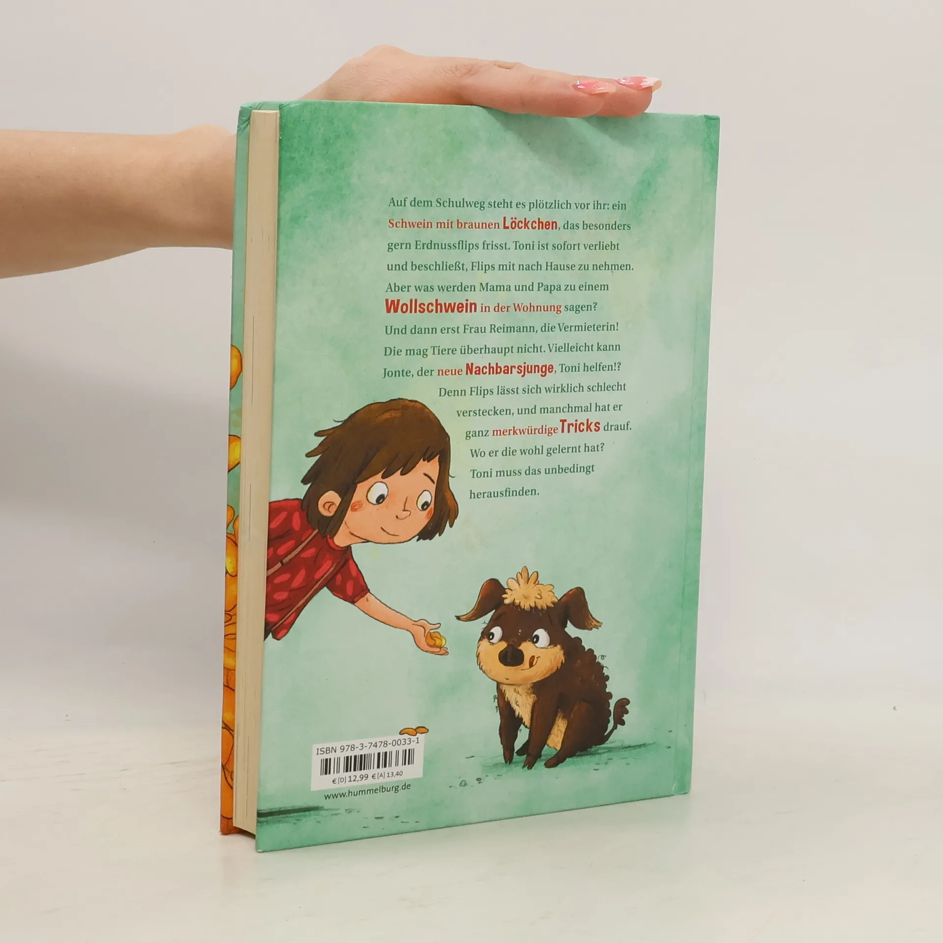 Ein Schwein bringt Glück! Auf dem Schulweg steht es plötzlich vor ihr: ein Schwein mit braunen Löckchen, das besonders gern Erdnussflips frisst. Toni ist sofort verliebt und beschließt, Flips mit nach Hause zu nehmen. Aber was werden Mama und Papa zu einem Wollschwein in der Wohnung sagen? Und dann erst Frau Reimann, die Vermieterin! Die mag Tiere überhaupt nicht. Vielleicht kann Jonte, der neue Nachbarsjunge, Toni helfen!? Denn Flips lässt sich wirklich schlecht verstecken, und manchmal hat er ganz merkwürdige Tricks drauf. Wo er die wohl gelernt hat? Toni muss das unbedingt herausfinden. Eine turbulente Freundschaftsgeschichte zu den Themen Tierliebe und Tierwohl
