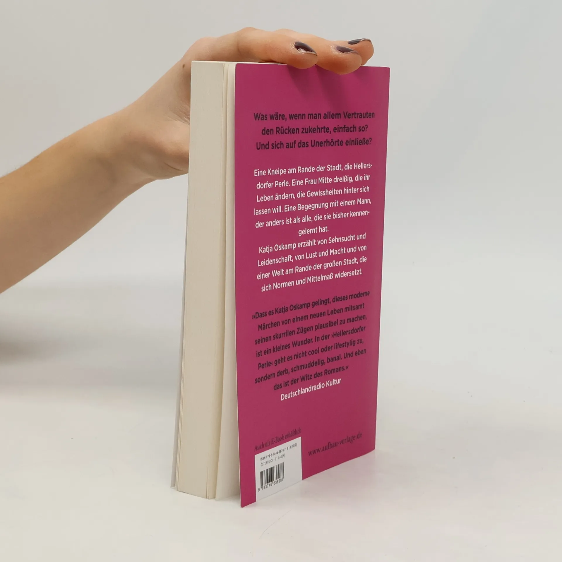 Was wäre, wenn man allem Vertrauten den Rücken zukehrte, einfach so? Und sich auf das Unerhörte einließe? Eine Kneipe am Rande der Stadt, die Hellersdorfer Perle. Eine Frau Mitte dreißig, die ihr Leben ändern, die Gewissheiten hinter sich lassen will. Eine Begegnung mit einem Mann, der anders ist als alle, die sie bisher kennengelernt hat. Katja Oskamp erzählt von Sehnsucht und Leidenschaft, von Lust und Macht und von einer Welt am Rande der großen Stadt, die sich Normen und Mittelmaß widersetzt. "Dass es Katja Oskamp gelingt, dieses moderne Märchen von einem neuen Leben mitsamt seinen skurrilen Zügen plausibel zu machen, ist ein kleines Wunder. In der 'Hellersdorfer Perle' geht es nicht cool oder lifestylig zu, sondern derb, schmuddelig, banal. Und eben das ist der Witz des Romans." Deutschlandradio Kultur