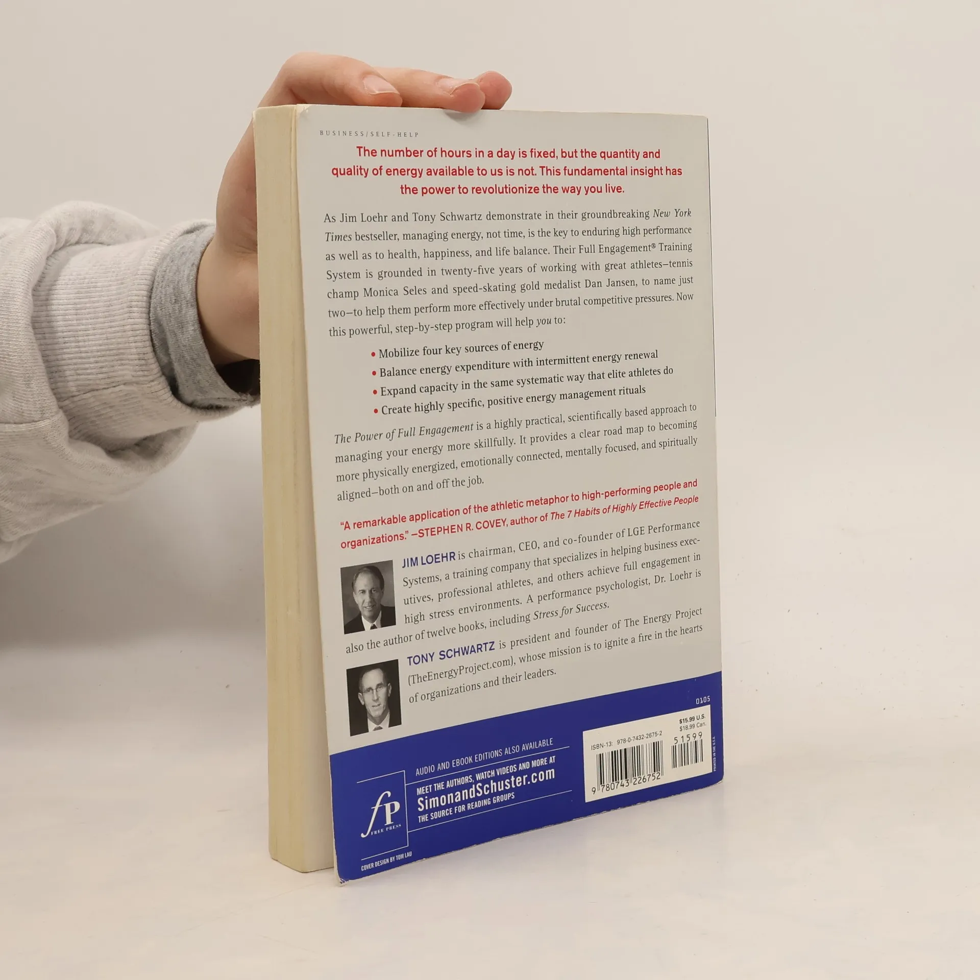 The number of hours in a day is fixed, but the quantity and quality of energy available to us is not. This fundamental insight has the power to revolutionize the way you live. As Jim Loehr and Tony Schwartz demonstrate in their groundbreaking New York Times bestseller, managing energy, not time, is the key to enduring high performance as well as to health, happiness, and life balance. Their Full Engagement Training System is grounded in twenty-five years of working with great athletes -- tennis champ Monica Seles and speed-skating gold medalist Dan Jansen, to name just two -- to help them perform more effectively under brutal competitive pressures. Now this powerful, step-by-step program will help you to: · Mobilize four key sources of energy · Balance energy expenditure with intermittent energy renewal · Expand capacity in the same systematic way that elite athletes do · Create highly specific, positive energy management rituals The Power of Full Engagement is a highly practical, scientifically based approach to managing your energy more skillfully. It provides a clear road map to becoming more physically energized, emotionally connected, mentally focused, and spiritually aligned -- both on and off the job.