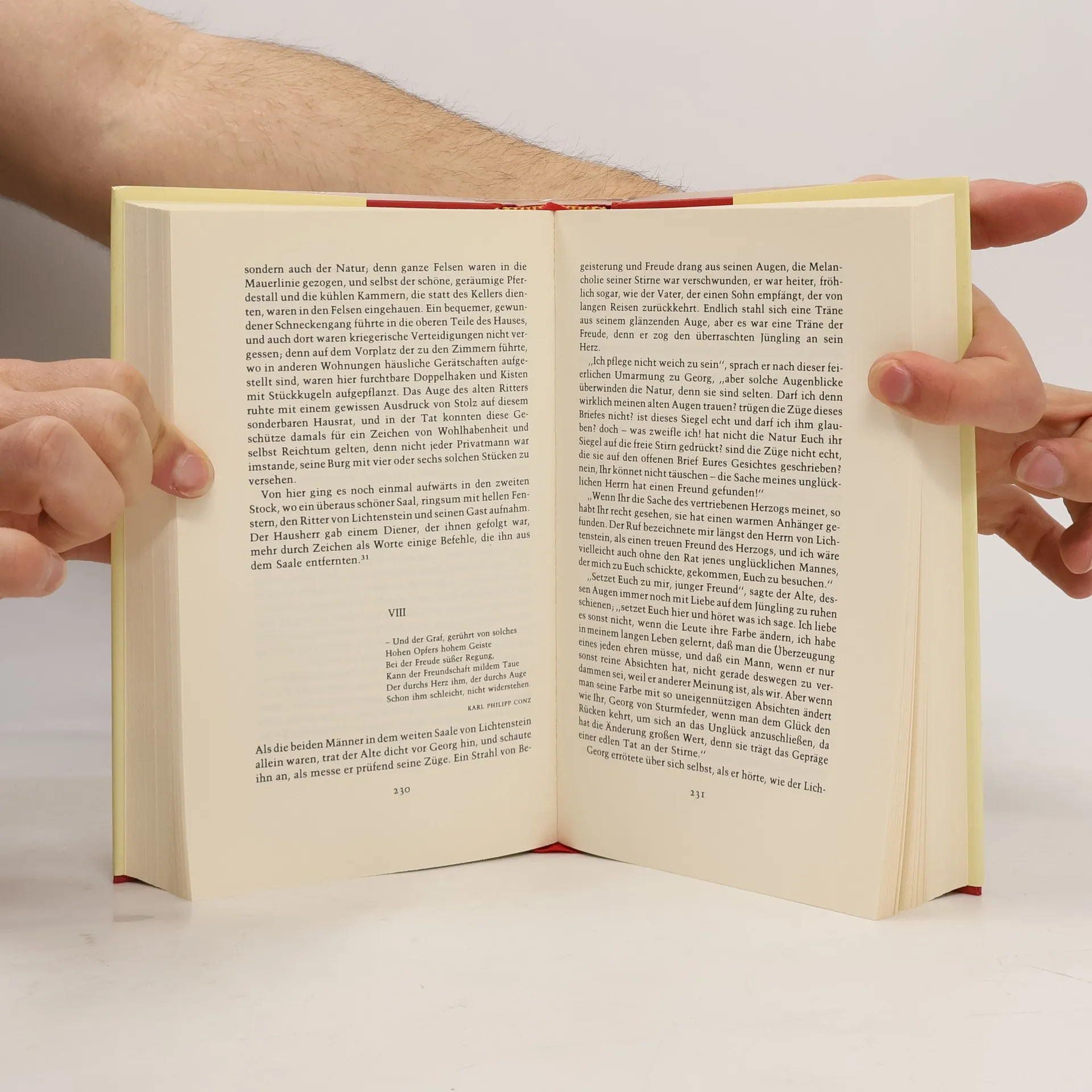 Wilhelm Hauff: Lichtenstein. Romantische Sage aus der wurttembergischen Geschichte Erstdruck: Stuttgart (Franckh) 1826. Buchdeckel mit Prägung sowie mit Bild- und Goldaufdruck, marmorierter Schnitt, mit Frontispiz, sowie schützendes Transparentblatt, Lesebändchen Ausgabe vor 1893