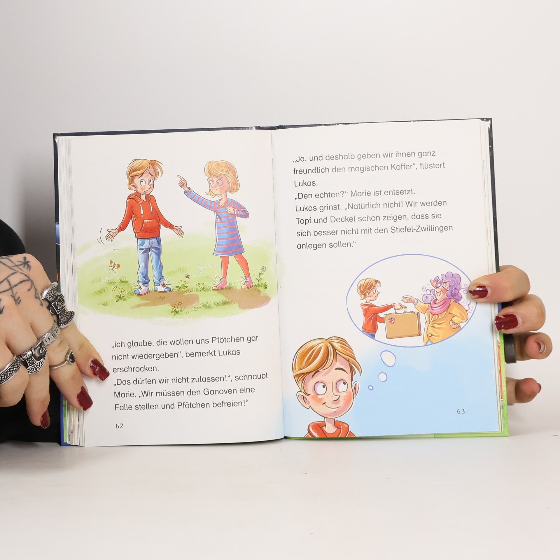 Auf zur wilden Kofferjagd Die Ganoven Topf und Deckel sind zurück. Sie jagen noch immer dem magischen Koffer hinterher, den die Zwillinge Lukas und Marie von ihrer Tante aus Übersee zum Geburtstag bekommen haben. Doch die jungen Detektive haben eine Idee, wie sie die Ganoven austricksen können. Nur - oh Schreck! - plötzlich ist Pfötchen verschwunden. Werden Lukas und Marie es schaffen, ihre Katze zu retten und den Koffer zu beschützen? Ein geheimnisvoller Koffer aus Übersee steht im Mittelpunkt der neuen Erstlesereihe von Cally Stronk. Die Zwillinge Marie und Lukas bekommen ihn an ihrem siebten Geburtstag von ihrer Tante aus Übersee geschickt. Was hat es mit dem Koffer auf sich? Und warum sollen die Zwillinge vor Groß und Klein auf der Hut sein? Schon bald stellt sich heraus, dass die Gegenstände im Koffer magische Fähigkeiten haben! Doch auch ein tollpatschiges Ganovenpärchen ist hinter dem Koffer her... Damit beginnt eine abenteuerliche Jagd nach dem magischen Detektivkoffer! Und das Beste: Die Leser können den Zwillingen bei der Jagd nach dem Koffer behilflich sein, indem sie die im Buch enthaltenen Bilderrätsel lösen. Ideal zum Lesenlernen für alle Krimifans und Rätselknacker!