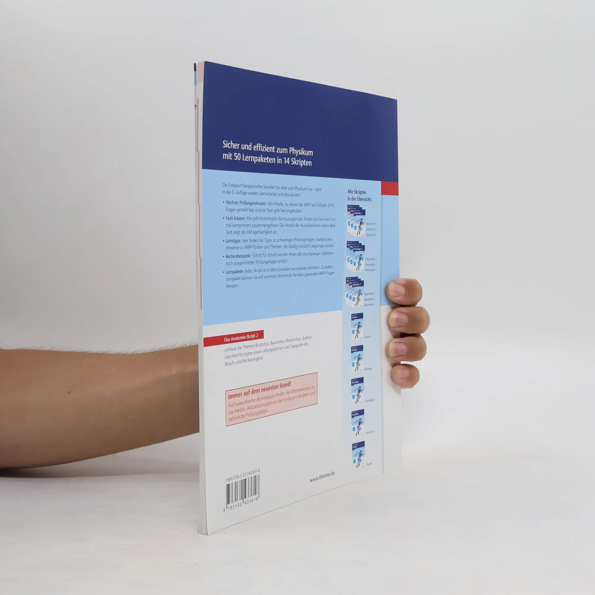 Endspurt VorklinikSicher und effizient zum Physikum mit 50 Lernpaketen in 14 SkriptenDie Endspurt-Skriptenreihe bereitet Dich ideal aufs Physikum vor - jetzt in der 3. Auflage wieder überarbeitet und aktualisiert!- Höchste Prü Alle Inhalte, zu denen das IMPP seit Frühjahr 2008 Fragen gestellt hat, sind im Text gelb hervorgehoben.- Fazit-Kä Alle gelb hinterlegten Kernaussagen des Textes sind hier noch einmal komprimiert zusammengefasst. Die Anzahl der Ausrufezeichen neben dem Text zeigt die Abfragehäufigkeit an.- Hier findest Du Tipps zu schwierigen Prüfungsfragen, Eselsbrücken, Hinweise zu IMPP-Tücken und Themen, die häufig mündlich abgefragt werden.- Schritt für Schritt werden Dir die Lösungswege mathematisch ausgerichteter Prüfungsfragen erklärt.- Lernpakete, Lernkalender und examen Jedes Skript ist in überschaubare Lernpakete unterteilt. Einen Lernkalender zur individuellen Planung Deiner Lernzeit findest Du unter www.thieme.de/endspurt. Zu jedem Lernpaket kannst Du auf examenonline.thieme.de die dazu passenden IMPP-Fragen kreuzen.Das Anatomie-Skript 2:Hier findest Du die Themen Brustsitus, Bauchsitus, Beckensitus, äußere Geschlechtsorgane, Leitungsbahnen und Topographie der Bauch- und Beckenorgane.Immer auf dem neuesten Stand!Auf www.thieme.de/endspurt findest Du Informationen zu examen online, Aktualisierungen zu den Endspurt-Skripten und zahlreiche Prüfungstipps.