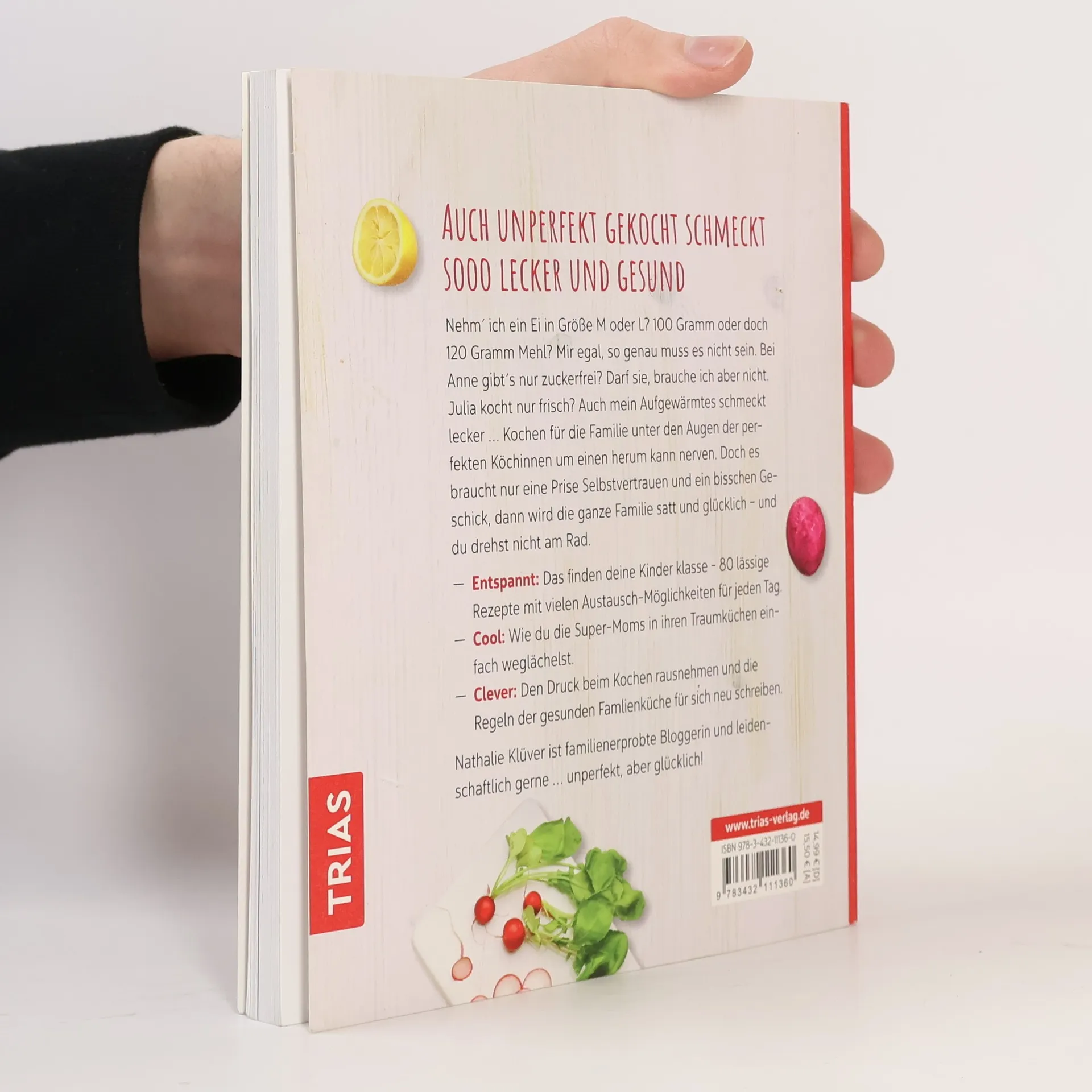 Auch unperfekt gekocht schmeckt sooo lecker und gesundNehm‘ ich ein Ei in Größe M oder L? 100 Gramm oder doch 120 Gramm Mehl? Mir egal, so genau muss es nicht sein. Bei Anne gibt´s nur zuckerfrei? Darf sie, brauche ich aber nicht. Julia kocht nur frisch? Auch mein Aufgewärmtes schmeckt lecker … Kochen für die Familie unter den Augen der perfekten Köchinnen um einen herum kann nerven. Doch es braucht nur eine Prise Selbstvertrauen und ein bisschen Geschick, dann wird die ganze Familie satt und glücklich – und du drehst nicht am Rad.- Das finden deine Kinder klasse - 80 lässige Rezepte mit vielen Austausch-Möglichkeiten für jeden Tag.- Wie du die Super-Moms in ihren Traumküchen einfach weglächelst.- Den Druck beim Kochen rausnehmen und die Regeln der gesunden Famlienküche für sich neu schreiben.Nathalie Klüver ist familienerprobte Bloggerin und leidenschaftlich gerne ...unperfekt, aber glücklich!
