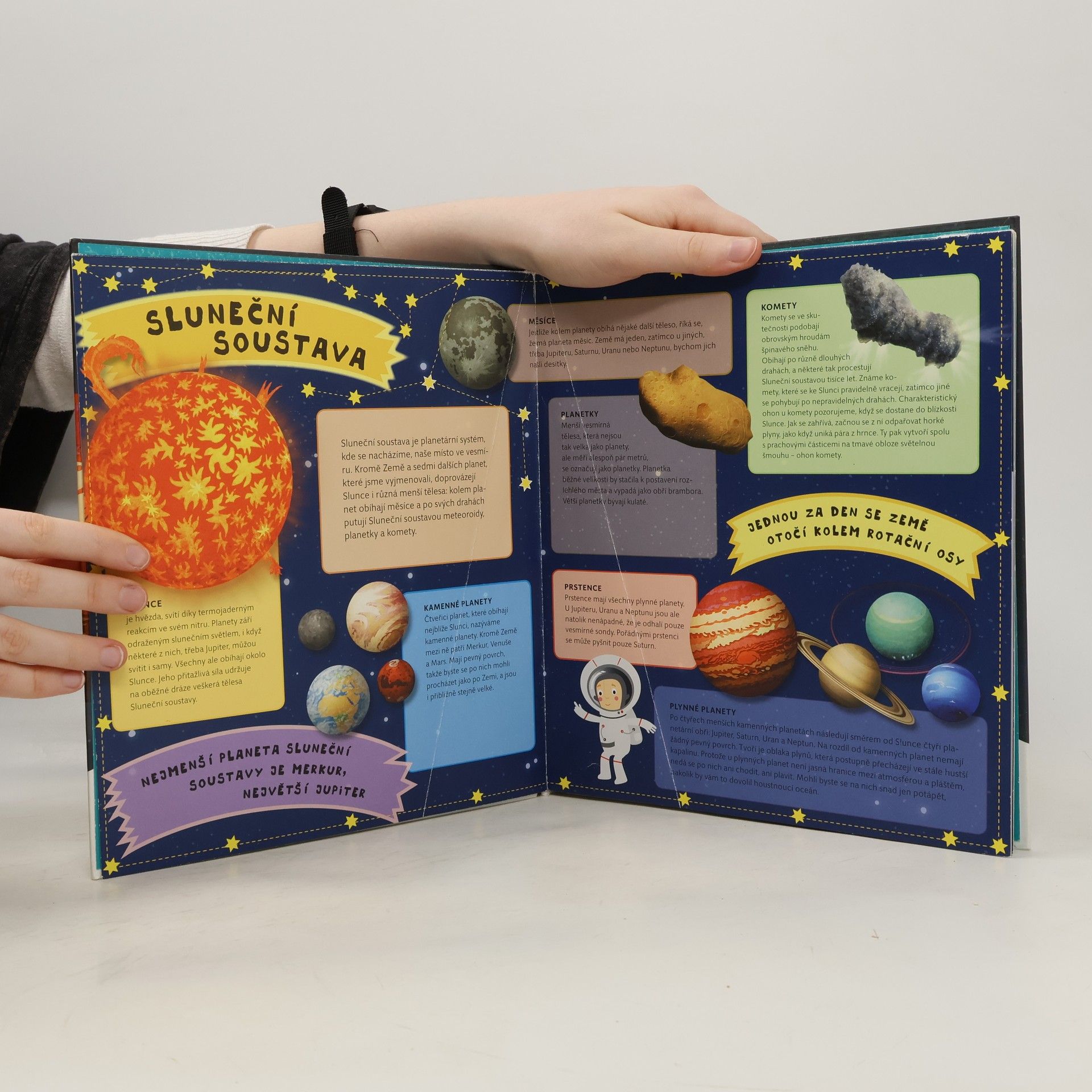 Nádherně ilustrovaný atlas s šesti velkými rozkládacími mapami odhalí všem malým zájemcům skrytá tajemství blízkého i  vzdáleného vesmíru. Čeká tě procházka po naší Sluneční soustavě, navštívíš komety a planetky, podnikneš výlet na Měsíc, seznámíš se s  prvními astronauty a vyzkoušíš si, jaké je cestovat v raketoplánu nebo žít na vesmírné stanici. Mapa severní i jižní oblohy tě naučí rozpoznávat ta nejznámější souhvězdí.