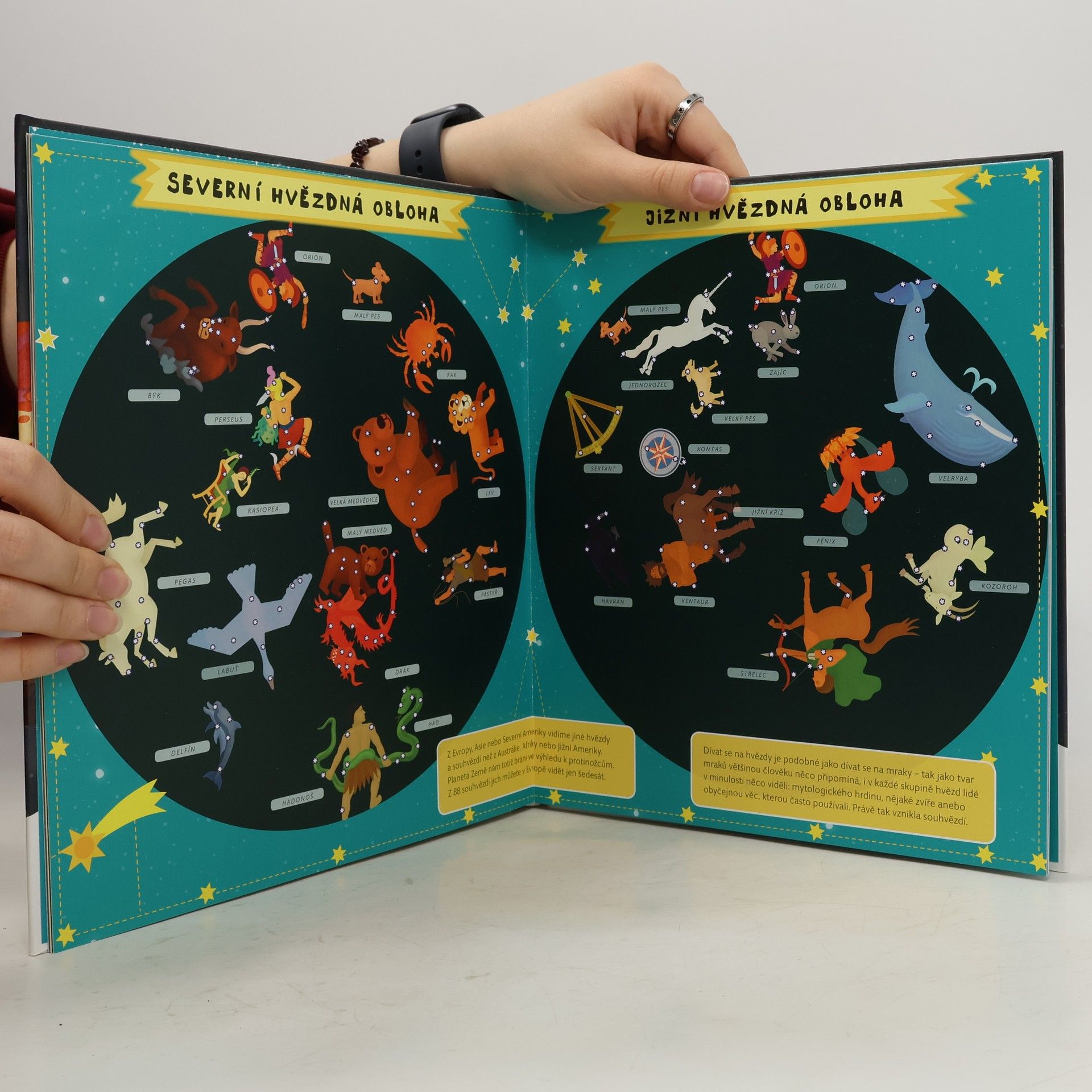 Nádherně ilustrovaný atlas s šesti velkými rozkládacími mapami odhalí všem malým zájemcům skrytá tajemství blízkého i  vzdáleného vesmíru. Čeká tě procházka po naší Sluneční soustavě, navštívíš komety a planetky, podnikneš výlet na Měsíc, seznámíš se s  prvními astronauty a vyzkoušíš si, jaké je cestovat v raketoplánu nebo žít na vesmírné stanici. Mapa severní i jižní oblohy tě naučí rozpoznávat ta nejznámější souhvězdí.