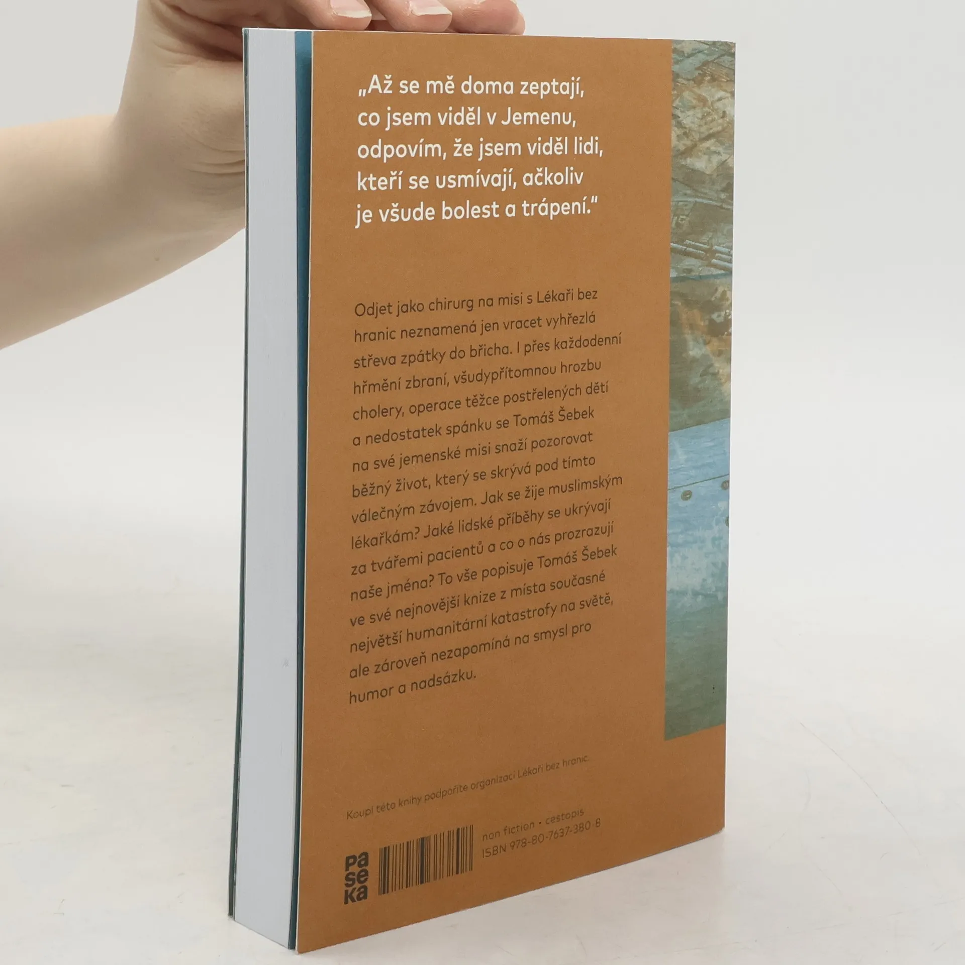 Odjet jako chirurg na misi s Lékaři bez hranic neznamená jen vracet vyhřezlá střeva zpátky do břicha. I přes každodenní hřmění střelby, všudypřítomnou hrozbu cholery, operace těžce postřelených dětí a nedostatek spánku se Tomáš Šebek na své jemenské misi snaží pozorovat běžný život, který se skrývá pod tímto válečným závojem. Jak se žije muslimským lékařkám? Jaké lidské příběhy se ukrývají za tvářemi pacientů a co o nás prozrazují naše jména? To vše popisuje Tomáš Šebek ve své nejnovější knize z místa současné největší humanitární katastrofy na světě, ale zároveň nezapomíná zapojit i smysl pro humor a nadsázku.