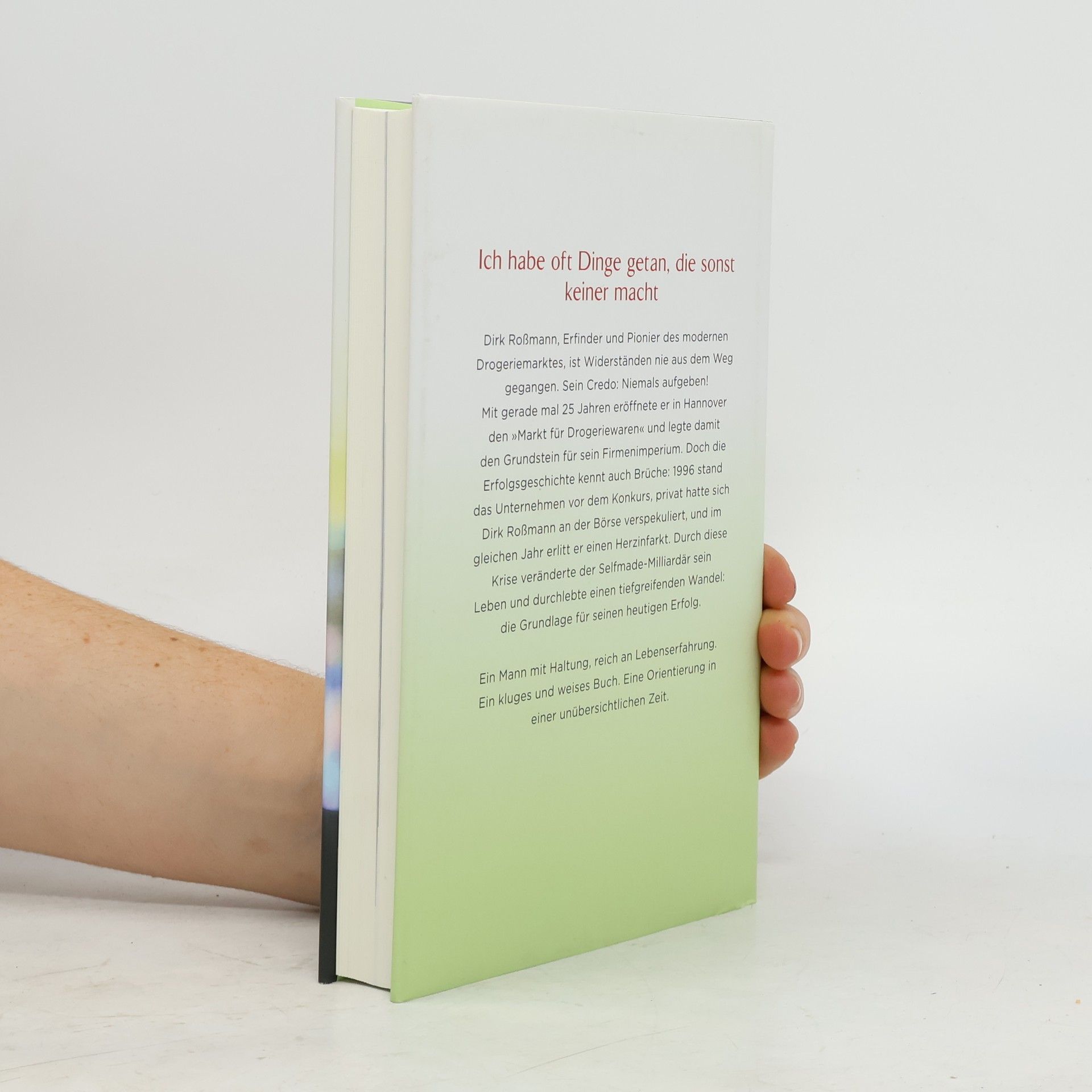Ich habe oft Dinge getan, die sonst keiner macht Er ist ein Mann der Widersprüche. Harter Wettbewerber einerseits, sozial engagiert andererseits. Dirk Roßmann, Erfinder und Pionier des modernen Drogeriemarktes, große Unternehmerpersönlichkeit und mehrfacher Millionär. Widerständen ist er nie aus dem Weg gegangen. Sein Credo: niemals aufgeben! Bereits im Alter von 12 zeigte sich sein Unternehmergeist: Er lieferte Drogerieartikel mit dem Fahrrad aus und verkaufte sie 10 Prozent billiger. Mit gerade mal 25 Jahren eröffnete er in Hannover den „Markt für Drogeriewaren“ und legte damit den Grundstein für sein Firmenimperium. Doch die Erfolgsgeschichte kennt auch Brüche: 1996 stand das Unternehmen vor dem Konkurs, privat hatte sich Dirk Roßmann an der Börse verspekuliert, und im gleichen Jahr erlitt er einen Herzinfarkt. "Von da an habe ich alles auf Null gestellt und versucht, die Firma zu retten." Durch diese Krise veränderte Dirk Roßmann sein Leben und durchlebte einen tiefgreifenden Wandel. Das sieht er heute als Grund für seinen Erfolg an. - Ein Mann mit Haltung, reich an Lebenserfahrung, ein kluges und weises Buch, eine Orientierung in einer unübersichtlichen Zeit.