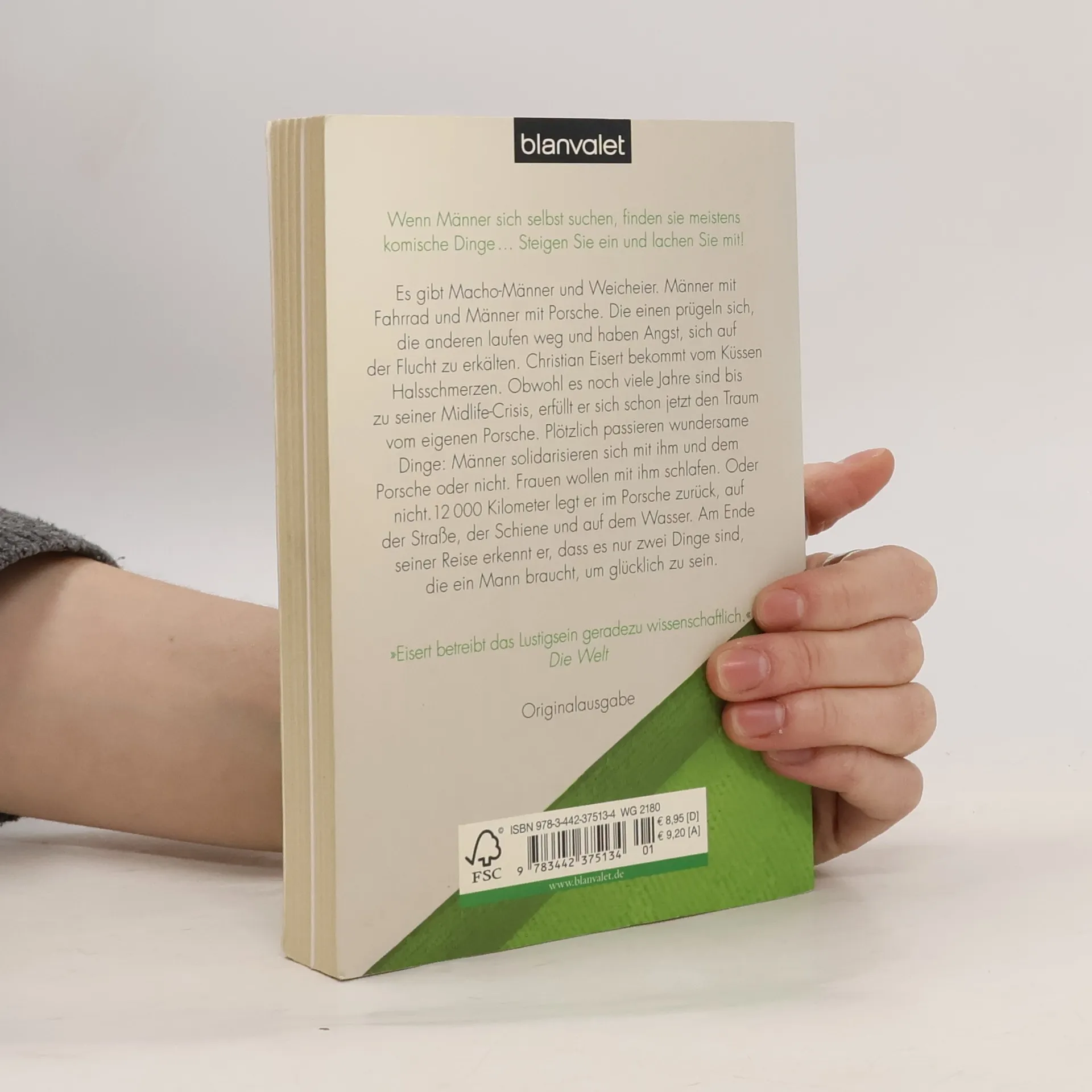 Wenn Männer sich selbst suchen, finden sie meistens komische Dinge. Steigen Sie ein und lachen Sie mit! Es gibt Macho-Männer und Weicheier. Männer mit Fahrrad und Männer mit Porsche. Die einen prügeln sich, die anderen laufen weg und haben Angst, sich auf der Flucht zu erkälten. Christian Eisert bekommt vom Küssen Halsschmerzen. Obwohl es noch viele Jahre sind bis zu seiner Midlife-Crisis, erfüllt er sich schon jetzt den Traum vom eigenen Porsche. Plötzlich passieren wundersame Dinge: Männer solidarisieren sich mit ihm und dem Porsche oder nicht. Frauen wollen mit ihm schlafen. Oder nicht. 12 000 Kilometer legt er im Porsche zurück, auf der Straße, der Schiene und auf dem Wasser. Am Ende seiner Reise erkennt er, dass es nur zwei Dinge sind, die ein Mann braucht, um glücklich zu sein.