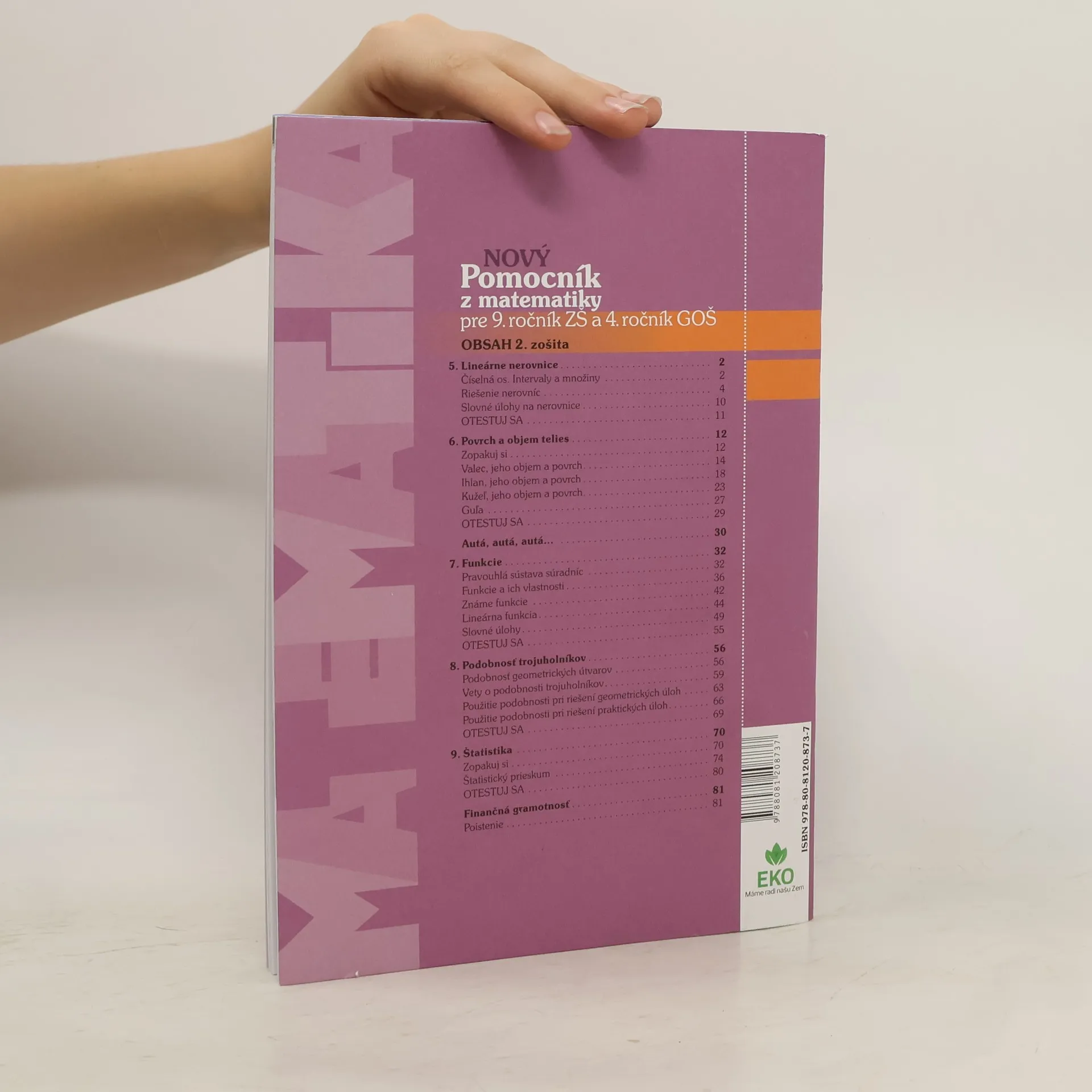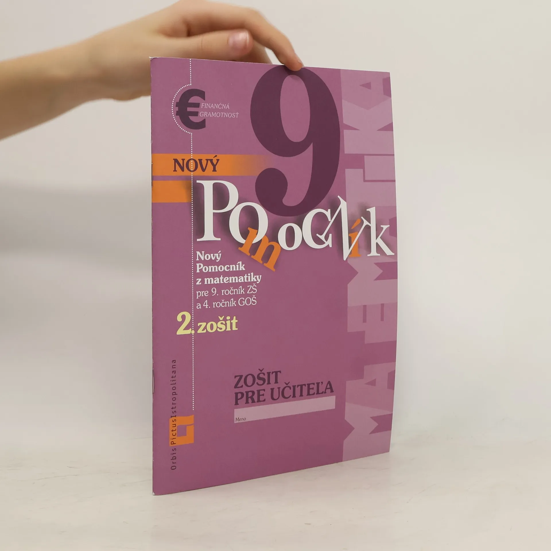 Tešiť sa môžete na vylepšenú formu pracovnej učebnice s implementovanými prvkami pracovného zošita a učebnice – pracovnú učebnicu. Spracovaná je na základe požiadaviek učiteľov matematiky skúseným autorským kolektívom aktívnych učiteľov ZŠ a GOŠ. Autorský kolektív zastrešuje Oddelenie didaktiky matematiky UK. Úlohy sú koncipované tak, aby systematicky rozvíjali nielen matematickú, ale aj čitateľskú a finančnú gramotnosť žiakov. Zošit pre učiteľa obsahuje riešenia úloh a návrhy na riešenia. Nový Pomocník 9/ 2 obsahuje: Povrch a objem telies Funkcie Podobnosť trojuholníkov Štatistika Opakovanie Stiahnite si tematický výchovno-vzdelávací plán: v pdf formáte (nie je možné kopírovať a upravovať ho) v xlsx formáte (je možné kopírovať z neho a upravovať ho) Finančnú gramotnosť pre 7., 8. a 9. ročník si môžete zdarma stiahnuť ako pracovné listy pre žiakov (i výsledky pre učiteľa). Titul je odporúčaný MŠVVaŠ SR.
