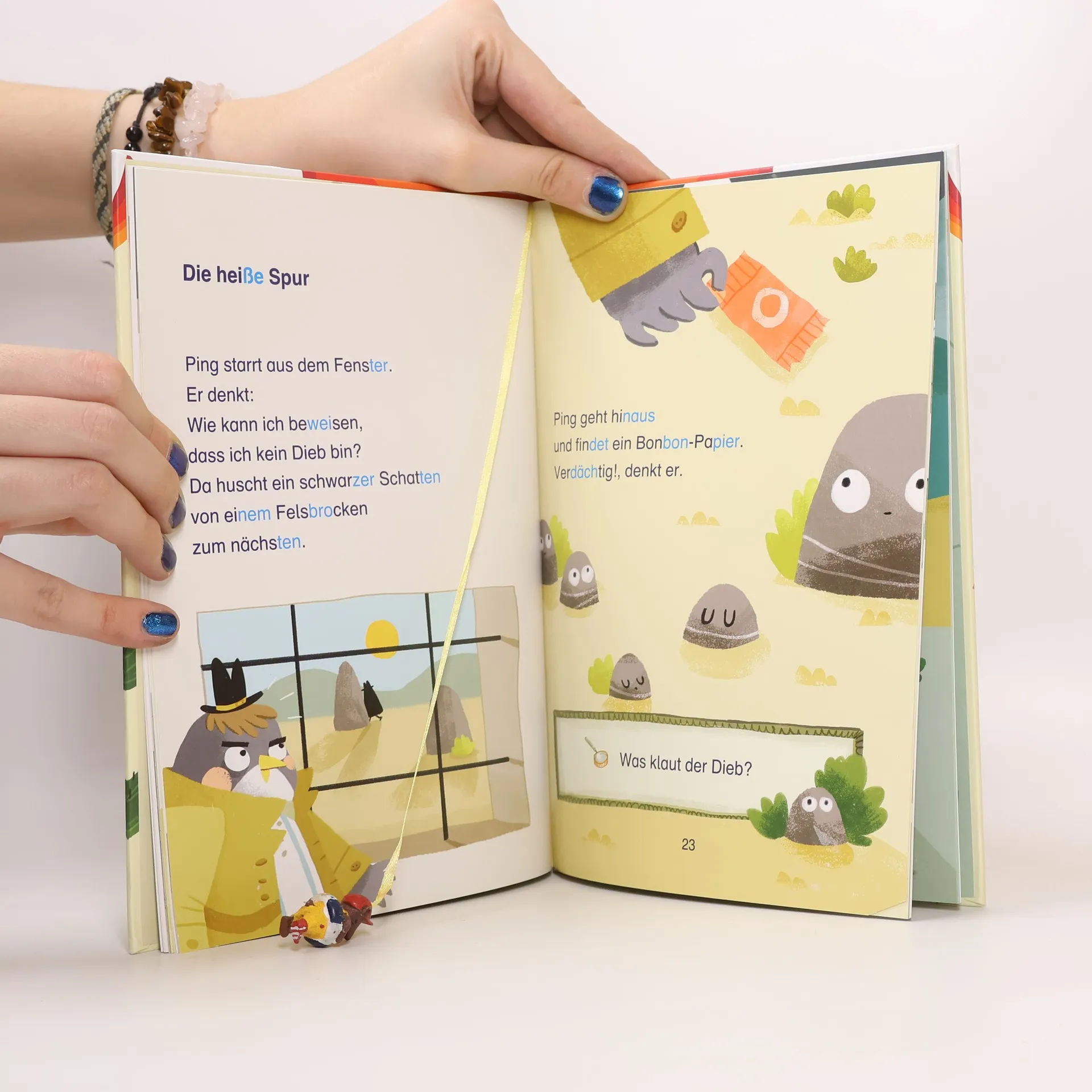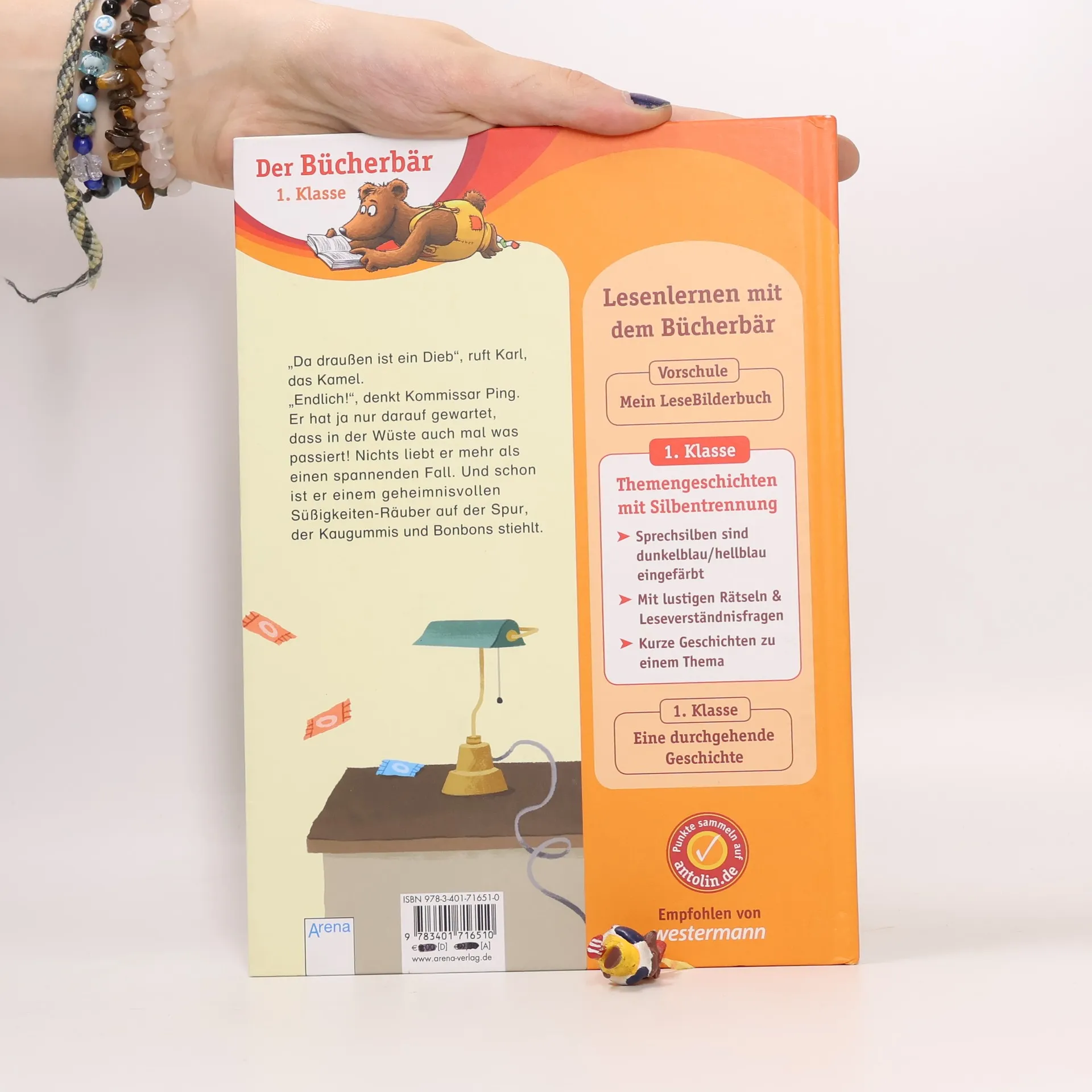 „Da draußen ist ein Dieb!“, ruft Karl, das Kamel. „Endlich!“, denkt Kommissar Ping. Er hat ja nur darauf gewartet, dass in der Wüste auch mal was passiert. Nichts liebt er mehr als einen spannenden Fall. Und schon ist er einem geheimnisvollen Süßigkeiten-Räuber auf der Spur … Lesenlernen mit dem Bücherbär Dieses Buch richtet sich an Leseanfänger in der 1. Klasse. Die besonders übersichtlichen Leseeinheiten und kurzen Zeilen sind ideal zum Lesenlernen. Das Hervorheben der Sprechsilben in dunkelblau/hellblau hilft dabei, ein Wort richtig lesen und verstehen zu können. So können Leseanfänger jede Sprechsilbe erkennen. Zusätzlich regen lustige Rätsel und Verständnisfragen zum Nachdenken und zum Gespräch über die Geschichten an. Denn Kinder, die viel Gelegenheit zum Sprechen haben, lernen auch schneller lesen. Empfohlen von Westermann Der Titel ist auf Antolin.de gelistet