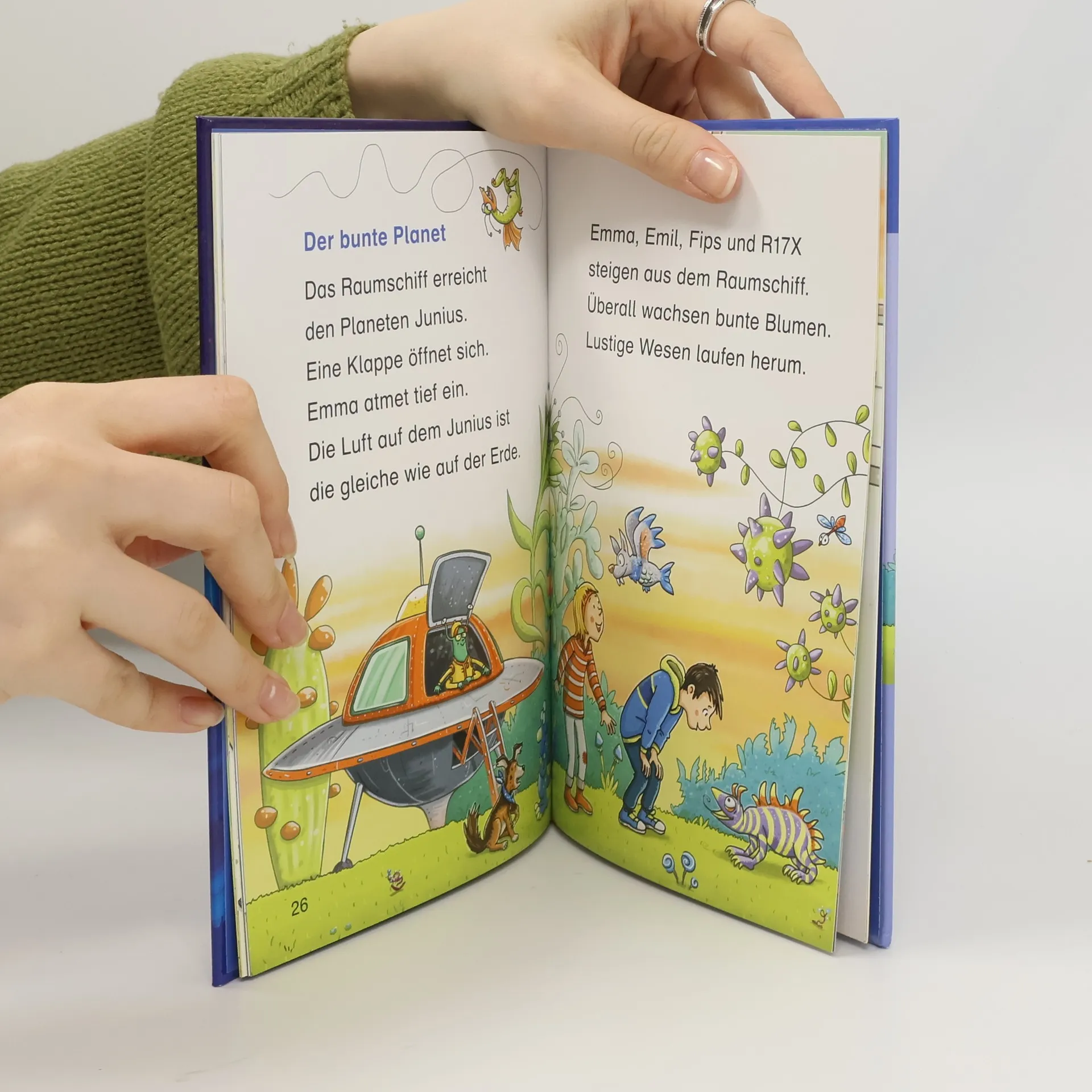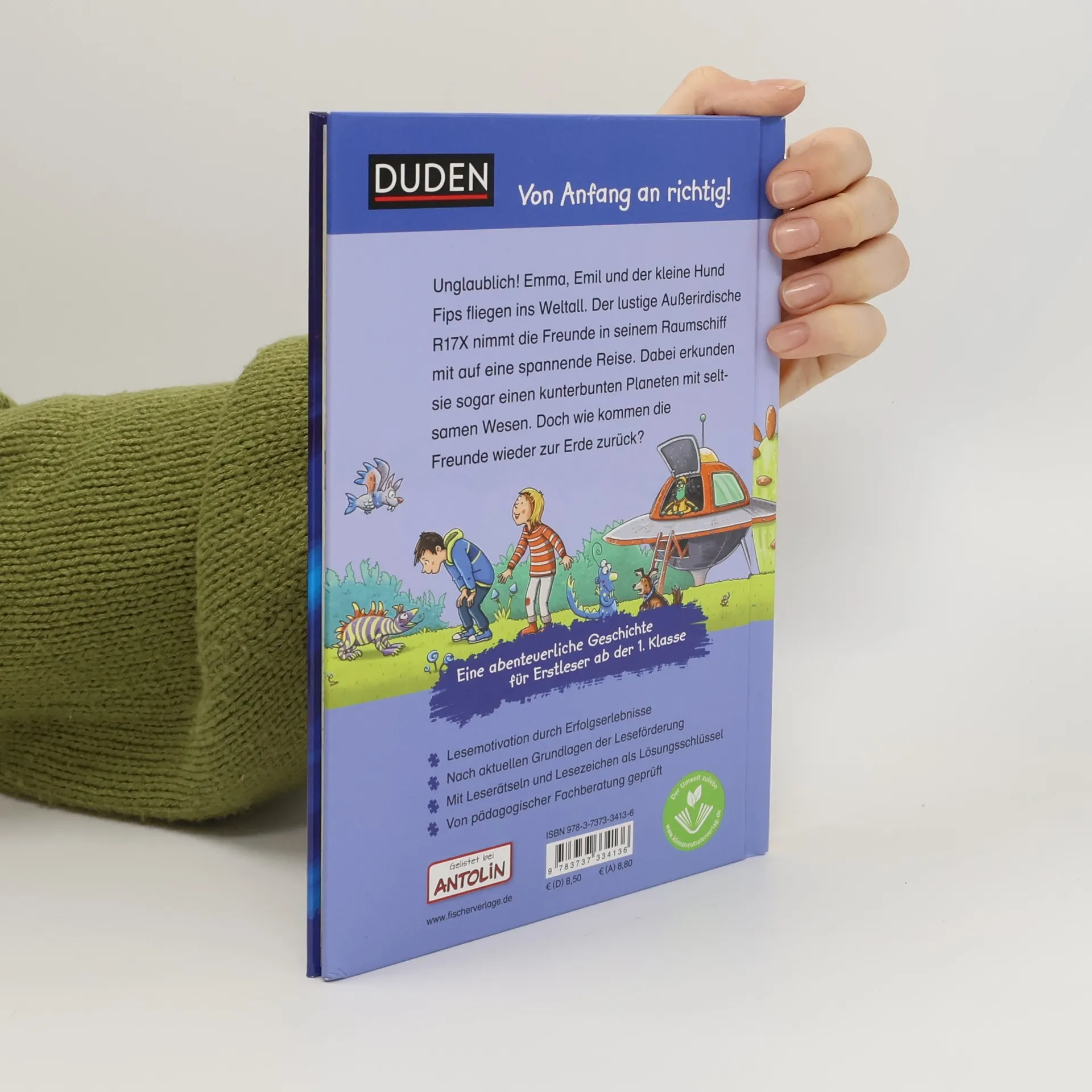 Willkommen an Bord! Emma, Emil und der kleine Hund Fips spielen Raumfahrer einer fernen Galaxie. Plötzlich befinden sich die Freunde tatsächlich im Raumschiff eines seltsamen Wesens. Der sympathische Außerirdische R17X nimmt die drei mit auf eine spannende Reise ins All. Dabei erkunden sie einen kunterbunten Planeten mit lustigen Tieren, und noch vieles mehr … Doch wie kommen die Freunde wieder zur Erde zurück? Ein unvergessliches Abenteuer! Duden – von Anfang an richtig! Lesenlernen leicht gemacht: Erstlesespaß für Kinder ab der 1. Klasse So geht zeitgemäße Leseförderung: Diese spannende und mit viel Liebe zum Detail illustrierte Erstlesegeschichte aus der Reihe "Leseprofi" von FISCHER Duden Kinderbuch sorgt garantiert für Lesespaß. Der Text ist genau auf die Bedürfnisse der Jungen und Mädchen zugeschnitten. So erleben sie schnell motivierende Erfolge. Kleine, abwechslungsreiche Rätsel zur Sicherung des Textverständnisses begleiten beim Lesen. Ein interaktives Lesezeichen dient als Lösungsschlüssel. Alle Titel der Reihe werden bei Antolin gelistet und von einer pädagogischen Fachberatung geprüft.