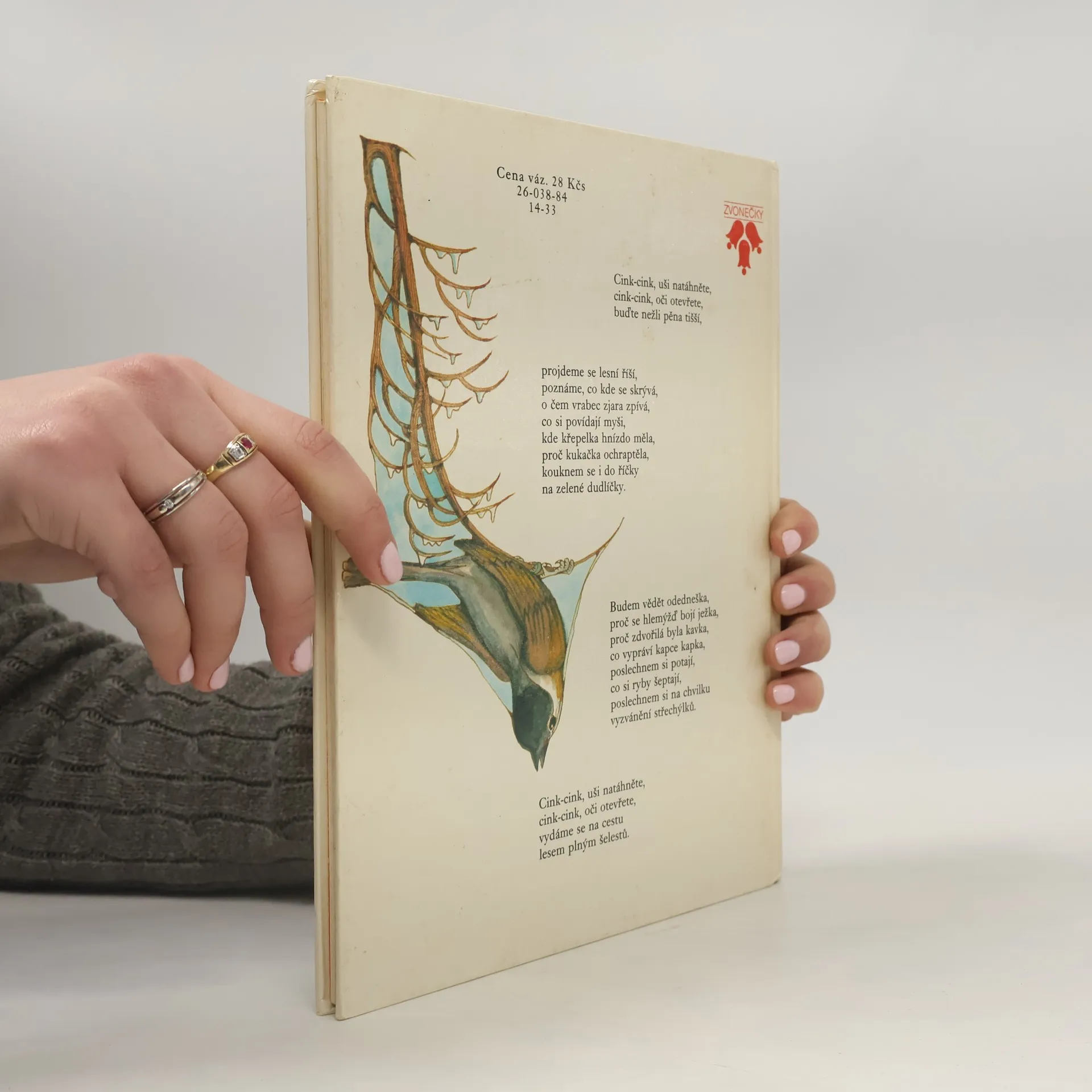 Cink-cink,uši natáhněte, cink-cink, oči otevřete, buďte nežli pěna tišší, projdeme se lesní říší, poznáme, co kde se skrývá, o čem vrabec zjara zpívá, co si povídají myši, kde křepelka hnízdo měla, proč kukačka ochraptěla, kouknem se i do říčky na zelené dudlíčky.Budem vědět odedneška, proč se hlemýžď bojí ježka, proč zdvořilá byla kavka, co vypráví kapce kapka, poslechnem si potají, co si ryby šeptají, poslechnem si na chvilku vyzvánění střechýlků. Cink-cink, uši natáhněte, cink-cink, oči otevřete, vydáme se na cestu lesem plným šelestů.