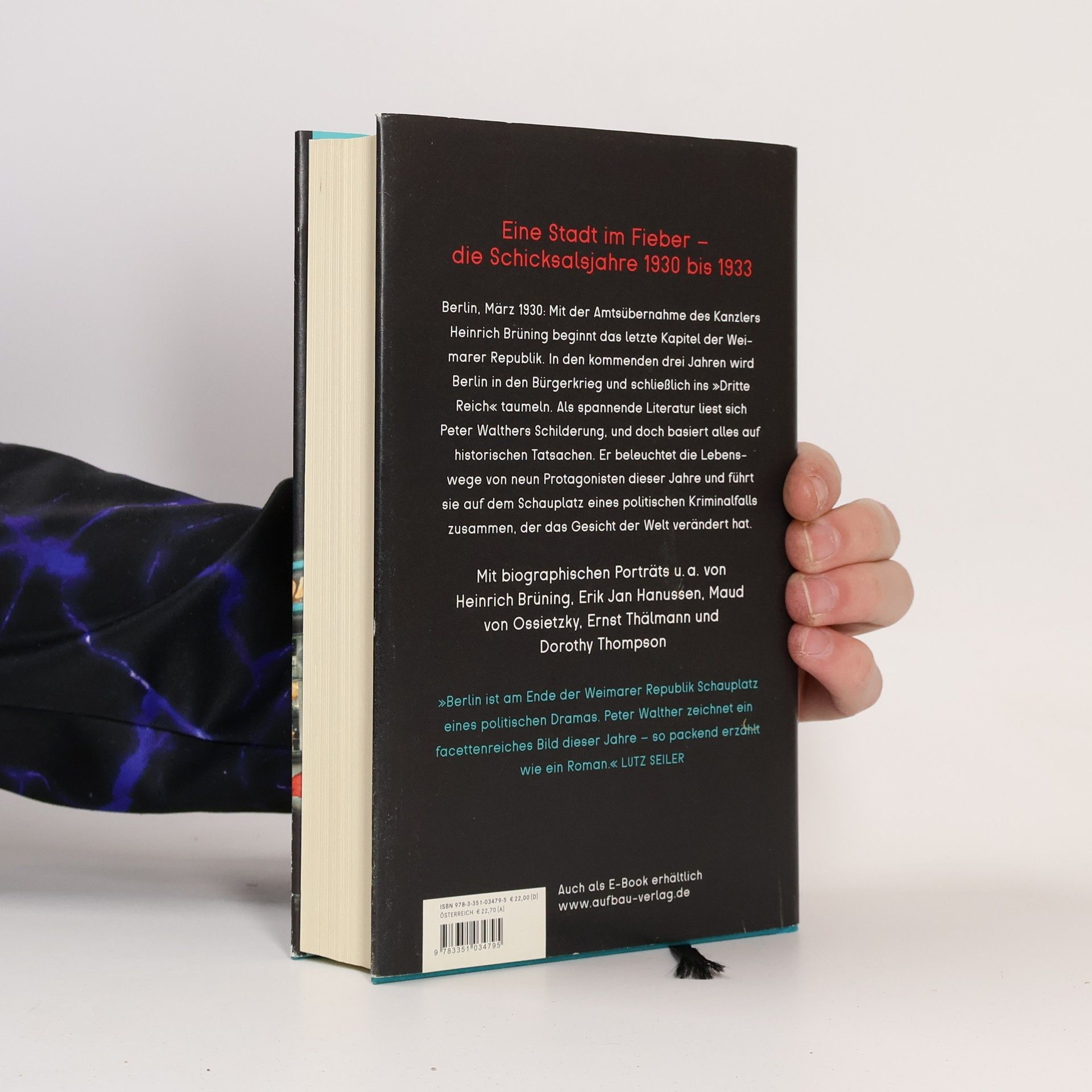 Berlin ist 1930 die glanzvolle Metropole des neuen Europa, schneller und freier als die anderen Hauptstädte des Kontinents. Nirgendwo sonst liegen Verschwendung und Elend so dicht beieinander. Während sich Kommunisten und Nationalsozialisten blutige Saalschlachten liefern und Dorothy Thompson Hitler interviewt, lädt der jüdische Hellseher Erik Jan Hanussen die Berliner SA-Führung zu „Weekend-Fahrten“ auf seiner Luxusyacht „Ursel IV“ ein. Maud von Ossietzky verfällt aus Sorge um ihren Mann Carl immer mehr dem Alkohol und der KPD-Vorsitzende Ernst Thälmann findet Trost bei seiner Geliebten. Heinrich Brüning, eben noch Kanzler des Deutschen Reichs, spielt am Abend seiner Entlassung mit seiner Patentochter „Mensch ärgere Dich nicht“. Am Ende geht es nur noch um eins: Kommt das »Dritte Reich«? Mit biographischen Porträts u. a. von Heinrich Brüning, Erik Jan Hanussen, Maud von Ossietzky, Ernst Thälmann und Dorothy Thompson. »Berlin ist am Ende der Weimarer Republik Schauplatz eines politischen Dramas. Peter Walther zeichnet ein facettenreiches Bild dieser Jahre ― so packend erzählt wie ein Roman.« LUTZ SEILER