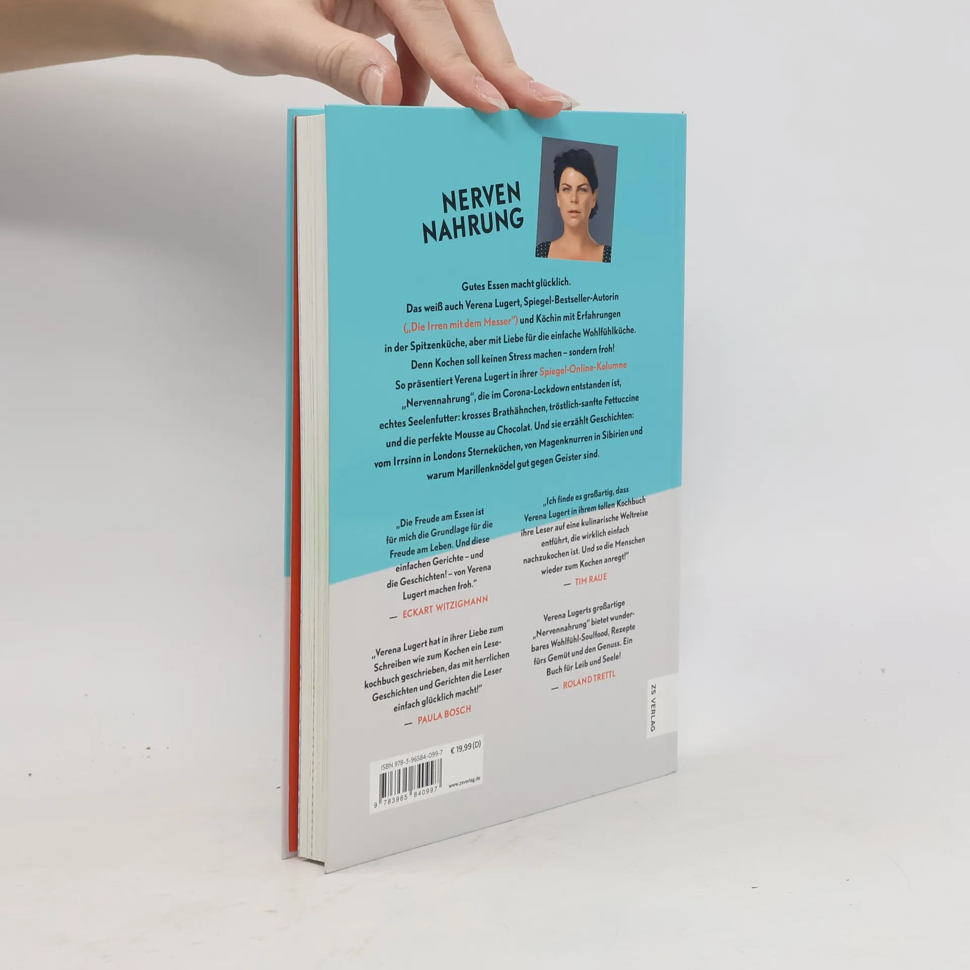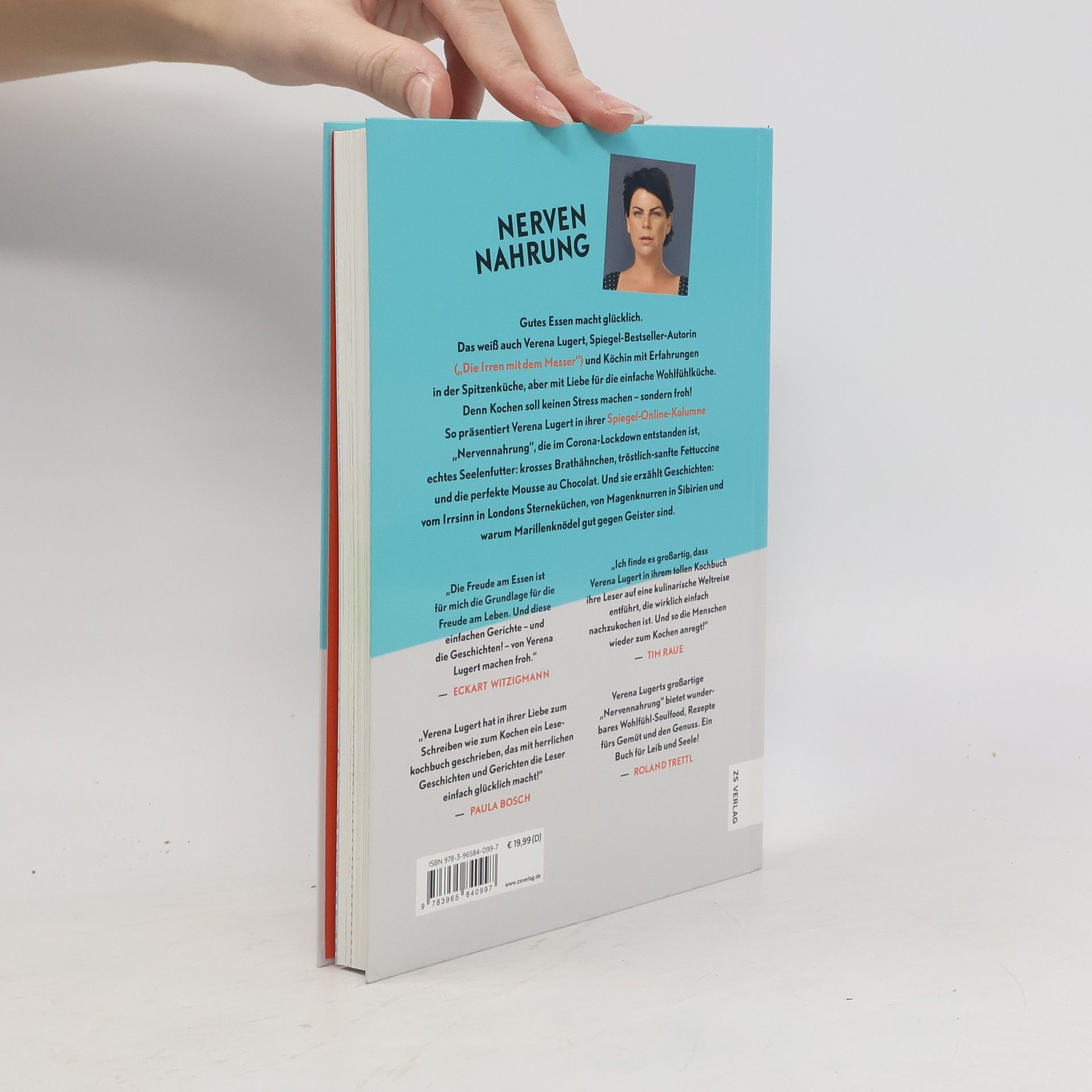 Eine Gabel der frischen Spaghetti Carbonara, und wir finden uns gedanklich in einer belebten Gasse in Rom wieder. Denn Essen ist mehr als nur Nahrungsaufnahme. Es ist ein Feuerwerk der Sinne. Je besser die Speise, desto größer das Glücksgefühl. Das weiß auch Verena Lugert, Journalistin und Köchin mit einem Händchen für das Besondere. Sie besuchte die legendäre Kochschule Cordon Bleu in London, hat bei Gordon Ramsay und Heston Blumenthal gearbeitet und dabei gelernt, geschmackliche Highlights zu kochen. Ihr Credo in der Küche: Gutes Essen macht nicht nur satt, sondern auch glücklich – es ist wahre Nervennahrung! Und so präsentiert sie uns wöchentlich in der Spiegel-Kolumne „Nervennahrung“ ihre besonderen und vor allem einfachen Rezepte. Zu jedem Gericht erzählt sie Geschichten aus der Sterneküche, zu den Gerichten oder einfach von Geschmackskompositionen. Auf die Teller kommen marokkanisches Zitronenhähnchen, Fettuccine Alfredo, Risotto mit weißer Schokolade oder samtige Quarkklößchen in Mohnbutter. Über 40 Rezepte lassen schon beim Lesen das Wasser im Mund zusammenlaufen. So hilft uns Verena Lugert, die größte Herausforderung des Alltags zu meistern: Einfach zu kochen, aber trotzdem mit einer ordentlichen Portion Raffinesse.