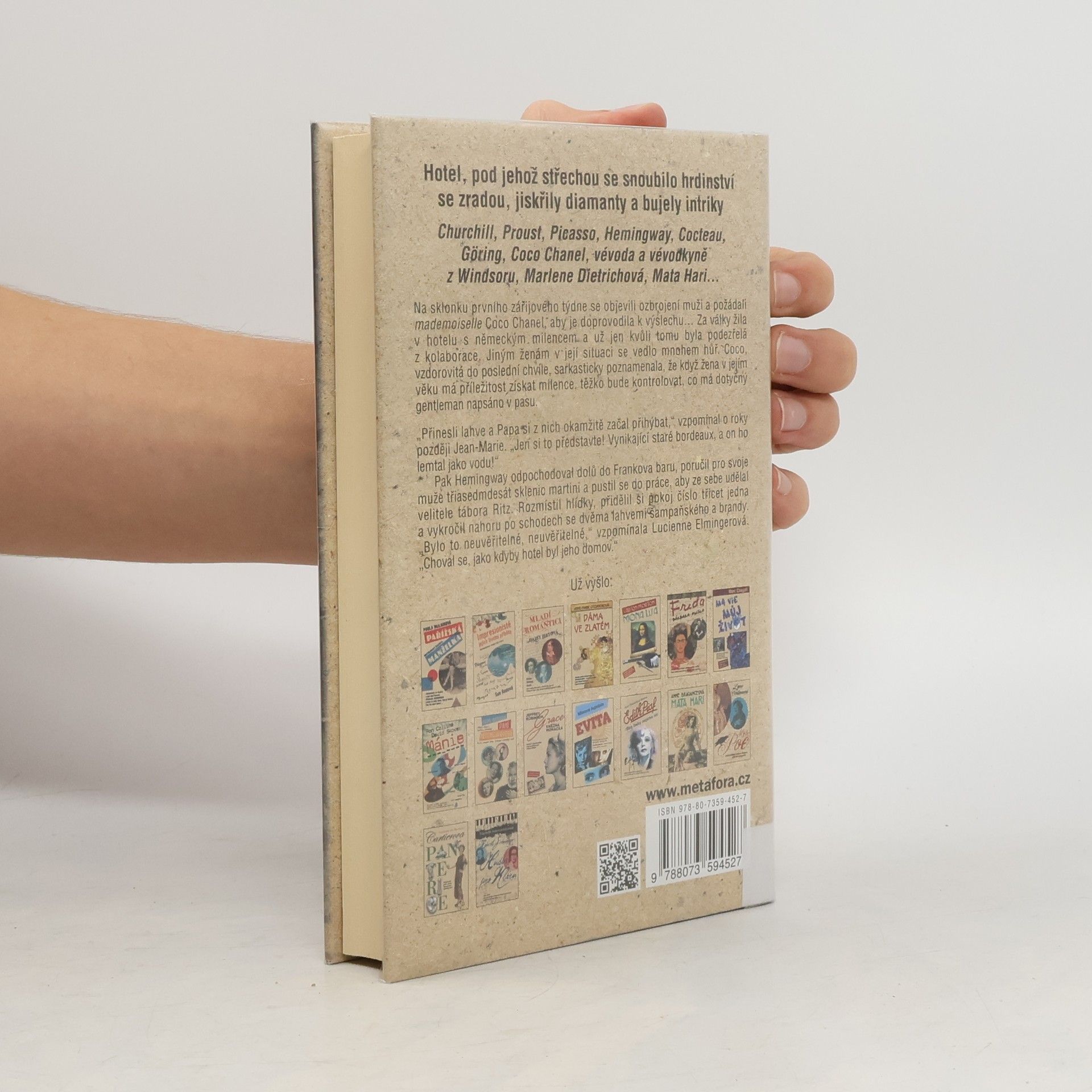 Život, smrt a zrada v nejslavnějším pařížském hotelu na Place Vendôme Hotel, jímž procházely dějiny Evropy. Historie rozmařilé Belle épogue, která s příchodem války zemřela za hřmotu bomb. Pod střechou Ritzu se snoubila odvaha se zradou, jiskřily diamanty, bujely intriky. Churchill, Proust, Picasso, Hemingway, Cocteau, Göring, Coco Chanel, vévoda a vévodkyně z Windsoru, Marlene Dietrichová... Státníci, spisovatelé, dvojití agenti, filmové hvězdy, aristokrati, padouši i hrdinové, ti všichni sepsali paměti tohoto hotelu, příběh o hrdinství i zradě, o drogách a sexu. Proslulá Coco Chanel si zde užívá se svým německým milencem, obávaný Hermann Göring tu polehává v pyžamu... Někdejší paní Simpsonová svému muži Edwardovi, který se kvůli ní vzdal anglického trůnu, veřejně nasazuje parohy... A bouřlivák Ernest Hemingway nakonec Ritz osvobodí... „Románový příběh by nemohl být barvitější a napínavější než skutečná historie statečnosti i zrady, sexuálních skandálů, bujarých večírků a politických intrik, která se odehrála v tomhle hotelu."