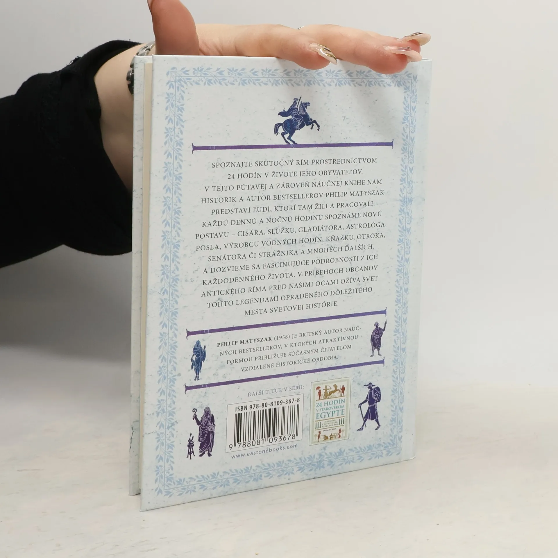 Jeden deň v živote ľudí, ktorí tam žili. Spoznajte skutočný Rím prostredníctvom 24 hodín v živote jeho obyvateľov. V tejto pútavej a zároveň náučnej knihe nám historik a autor bestsellerov Philip Matyszak predstaví ľudí, ktorí tam žili a pracovali. Každú dennú a nočnú hodinu spoznáme novú postavu – cisára, slúžku, gladiátora, astrológa, posla, výrobcu vodných hodín, kňažku, otroka, senátora či strážnika a mnohých ďalších, a dozvieme sa fascinujúce podrobnosti z ich každodenného života. V príbehoch občanov antického Ríma pred našimi očami ožíva svet tohto legendami opradeného dôležitého mesta svetovej histórie.