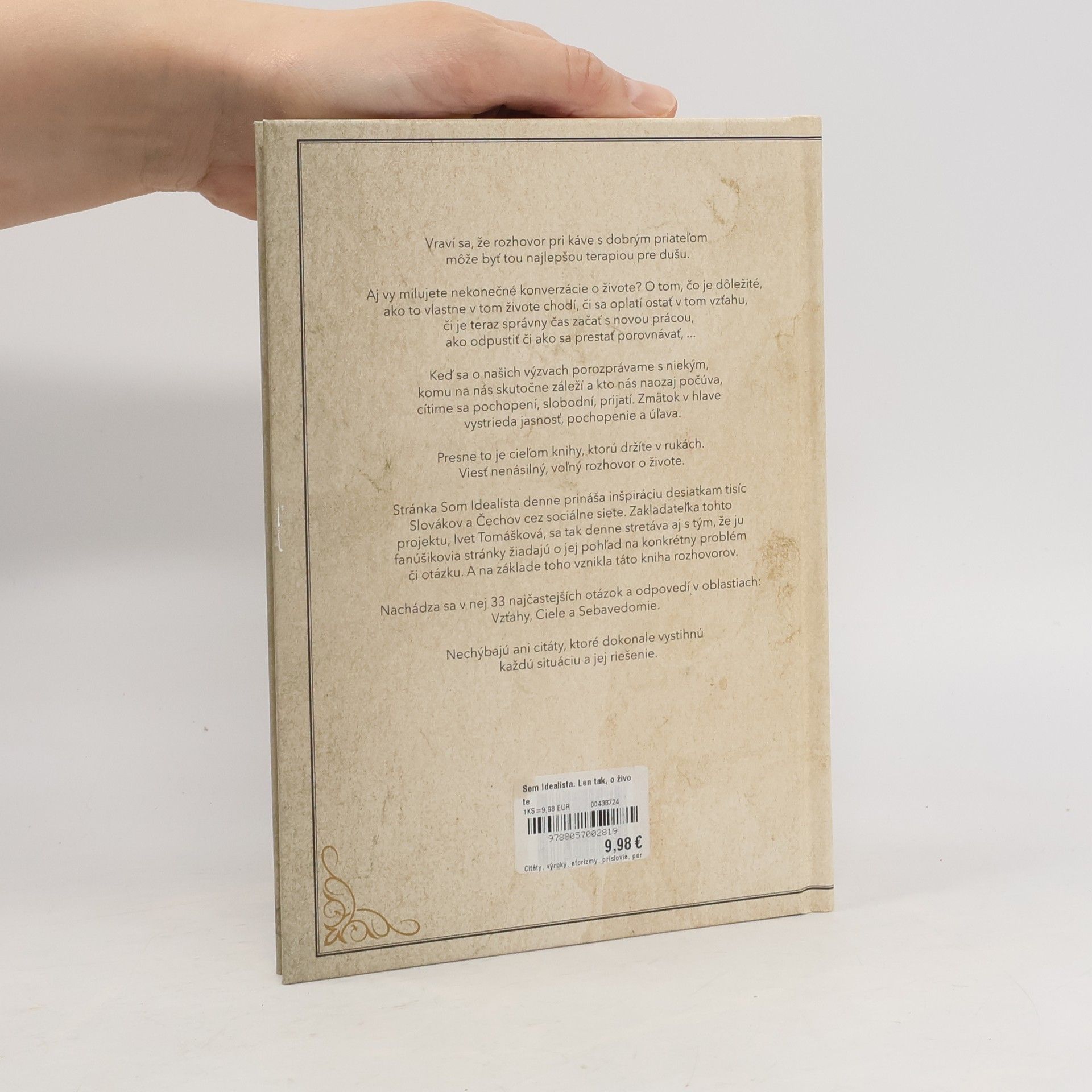 Vraví sa, že rozhovor pri káve s dobrým priateľom môže byť tou najlepšou terapiou pre dušu. Aj vy milujete nekonečné konverzácie o živote? O tom, čo je dôležité, ako to vlastne v tom živote chodí, či sa oplatí ostať v tom vzťahu, či je teraz správny čas začať s novou prácou, ako odpustiť či ako sa prestať porovnávať, ... Keď sa o našich výzvach porozprávame s niekým, komu na nás skutočne záleží a kto nás naozaj počúva, cítime sa pochopení, slobodní, prijatí. Zmätok v hlave vystrieda jasnosť, pochopenie a úľava. Presne to je cieľom knihy, ktorú držíte v rukách. Viesť nenásilný, voľný rozhovor o troch oblastiach života, ktorými sa denne všetci vo svojej mysli zaoberáme: Vzťahy, Ciele a Sebavedomie. Stránka Som Idealista denne prináša inšpiráciu desiatkam tisíc Slovákov a Čechov cez sociálne siete. Zakladateľka tohto projektu, Ivet Tomášková, sa tak denne stretáva aj s tým, že ju fanúšikovia stránky žiadajú o jej pohľad na konkrétny problém či otázku. A na základe toho vznikla táto kniha rozhovorov. V knihe sa nachádza 33 najčastejších otázok, ktoré sa týkaju týchto troch hlavných tém. Ku každej otázke nájdete okrem hlbšej praktickej odpovede aj citát zo stránky Som Idealista, ktorý ju dokonale vystihuje.
