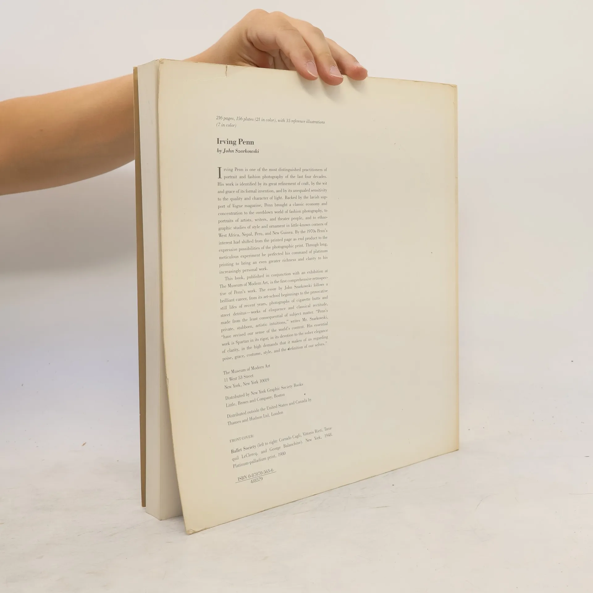 One of the most distinguished practitioners of portrait and fashion photography of the mid-twentieth century, Irving Penn's work is identified by its refinement of craft, by the wit and grace of its formal invention, and by its sensitivity to the quality and character of light. Backed by Vogue magazine, Penn brought a classic economy and concentration to the overblown world of fashion photography, to portraits of artists, writers, and theater people, and to ethnographic studies of style and ornament in little-known corners of West Africa, Nepal, Peru, and New Guinea. This book, published in conjunction with an exhibition at The Museum of Modern Art, is the first comprehensive retrospective of Penn's work. The essay by John Szarkowski follows a brilliant career, from its art-school beginnings to the provocative still lifes, photographs of cigarette butts and street detritus--works of eloquence and classical rectitude, made from the least consequential of subject matter.--From publisher description.