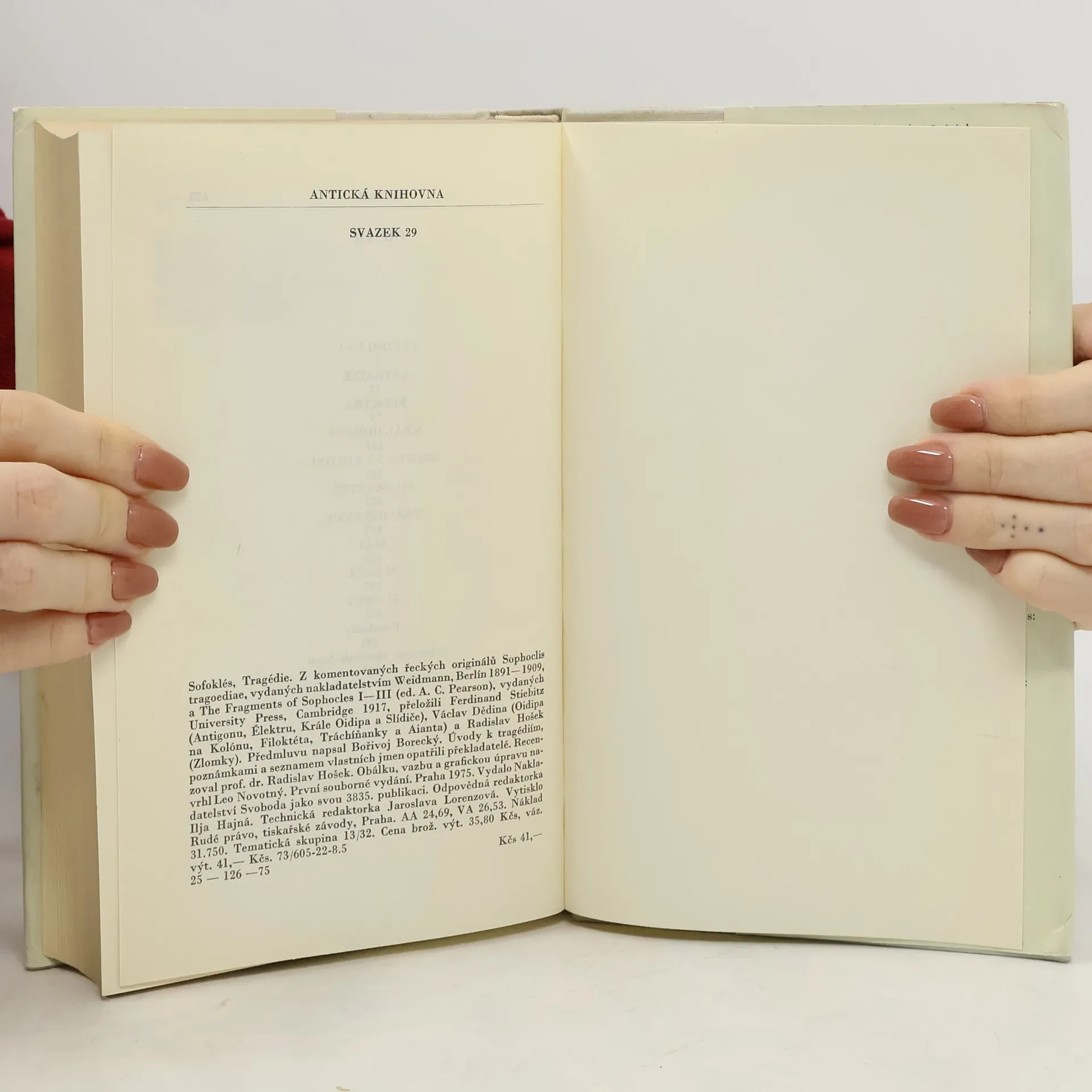 Z jeho díla se zachovalo sedm úplných tragédií a četné zlomky, především ze satyrského dramatu Slídiči, objeveného teprve roku 1912 v egyptských papyrech. Nejmohutnější jsou jeho tragédie z okruhu bájí thébských: Král Oidipús vypravuje na příběhu muže, jenž nevědomky zabil svého otce a žije v manželství s matkou, o nevyhnutelnosti osudu. Oidipús na Kolónu líčí konec jeho strastiplného života a Antigoné zachycuje osudy Oidipovy dcery, která přes zákaz pohřbí svého bratra a pyká za svůj čin smrtí, konflikt svědomí a příkaz otce. Z okruhu bájí homérských čerpal Sofoklés látku k tragédiím Aiás, jež zpracovává dramaticky sebevraždu hrdiny stojícího mravně výš než božstvo, Élektrá, která líčí osud Agamemnonovy dcery Élektry a pomstu Orestovu, a Filoktétés, jež předvádí psychologicky podaný příběh jednoho z homérských hrdinů. Poslední ze zachovaných tragédií, Tráchíňanky, líčí Hérakleovu smrt a jí předcházející rodinný konflikt. Sofoklés jako stále hraný dramatický básník náleží k nesmrtelným postavám světové vzdělanosti a jeho dílo k největšímu kulturnímu odkazu antiky. Souborně vychází v češtině poprvé.