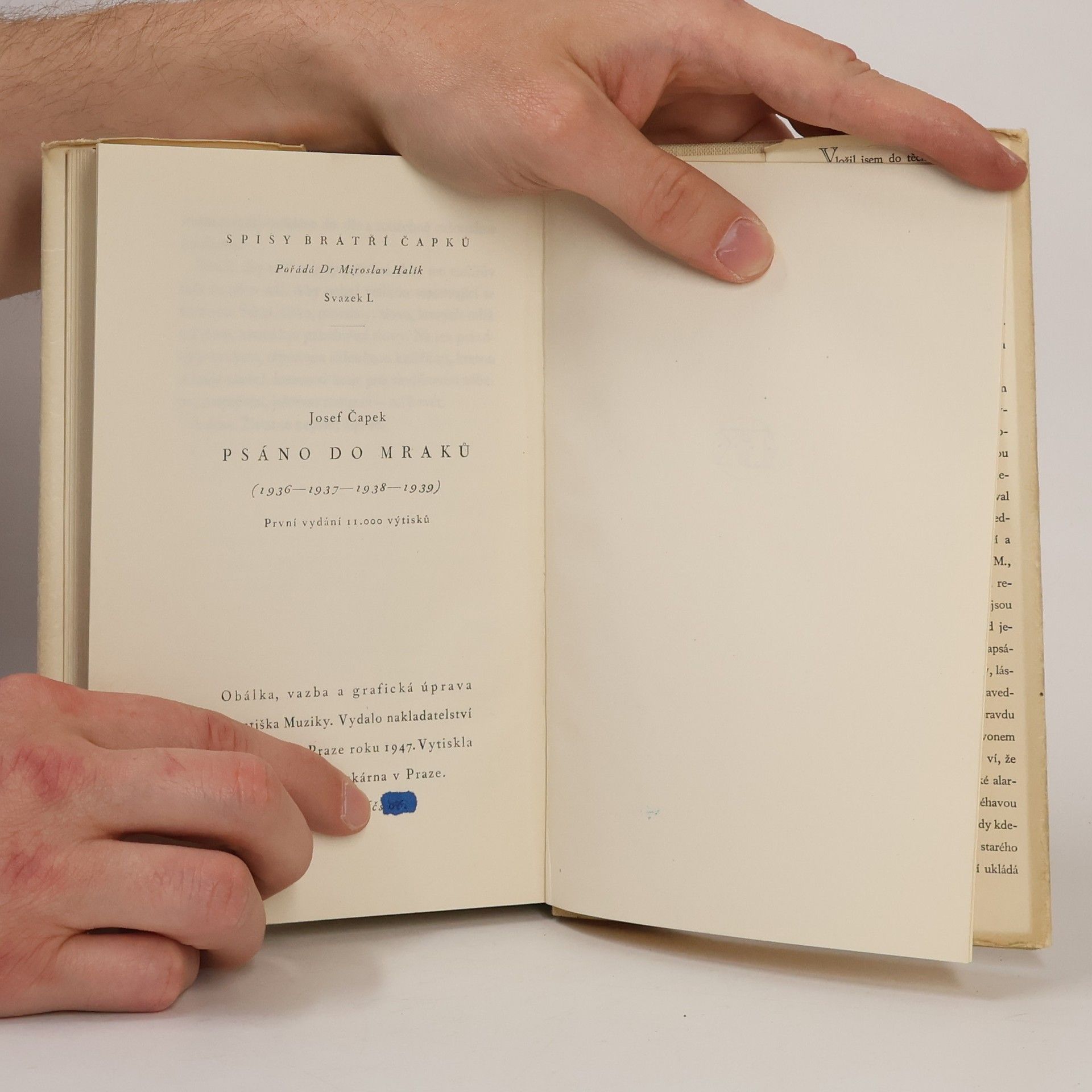 Posmrtně vydané dílo Josefa Čapka PSÁNO DO MRAKŮ, zveřejňující jeho filosofický zápisník z těžkého čtyřletí kolem katastrofální krize evropského podzimu 1938. Kniha Josefa Čapka není však jen produktem abstraktního myšlení a výsledkem pouhého teoretického uvažování. Má hlubokou souvislost se svou dobou a s přítomným člověkem. Za jejími řádky jako by se stále pohyboval film dějů evropského soumraku předválečných let a prolínal v myšlení a svědomí spisovatelovo.... celý text